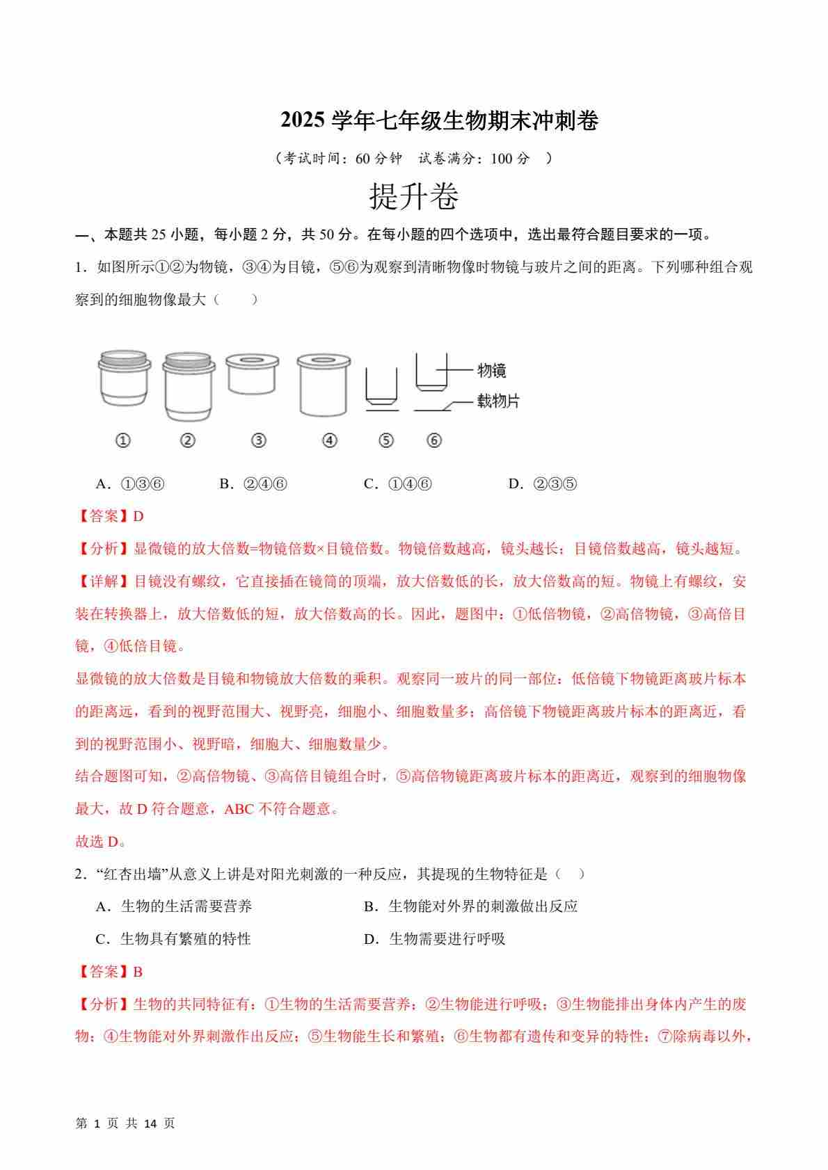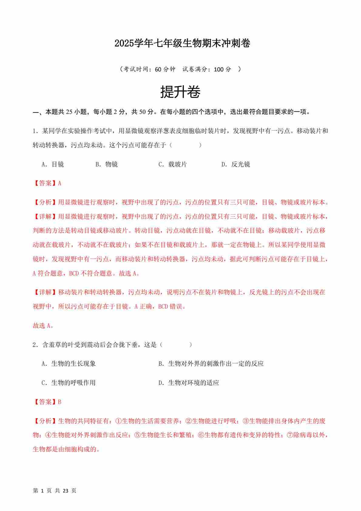 七上生物期末冲刺卷02(能力提升卷)(解析版)