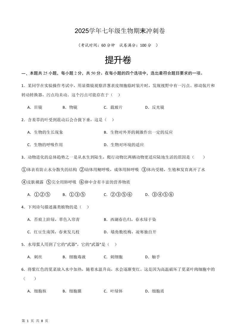 七上生物期末冲刺卷05(提升卷 )(原卷版)1