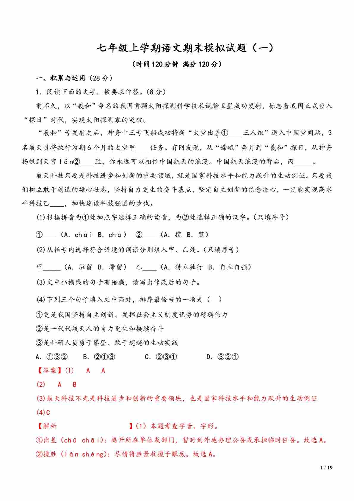 七年级语文上学期期末模拟试题(一)(部编版)(解析版)