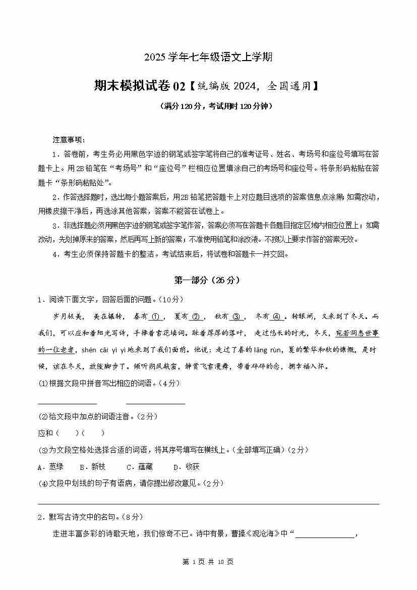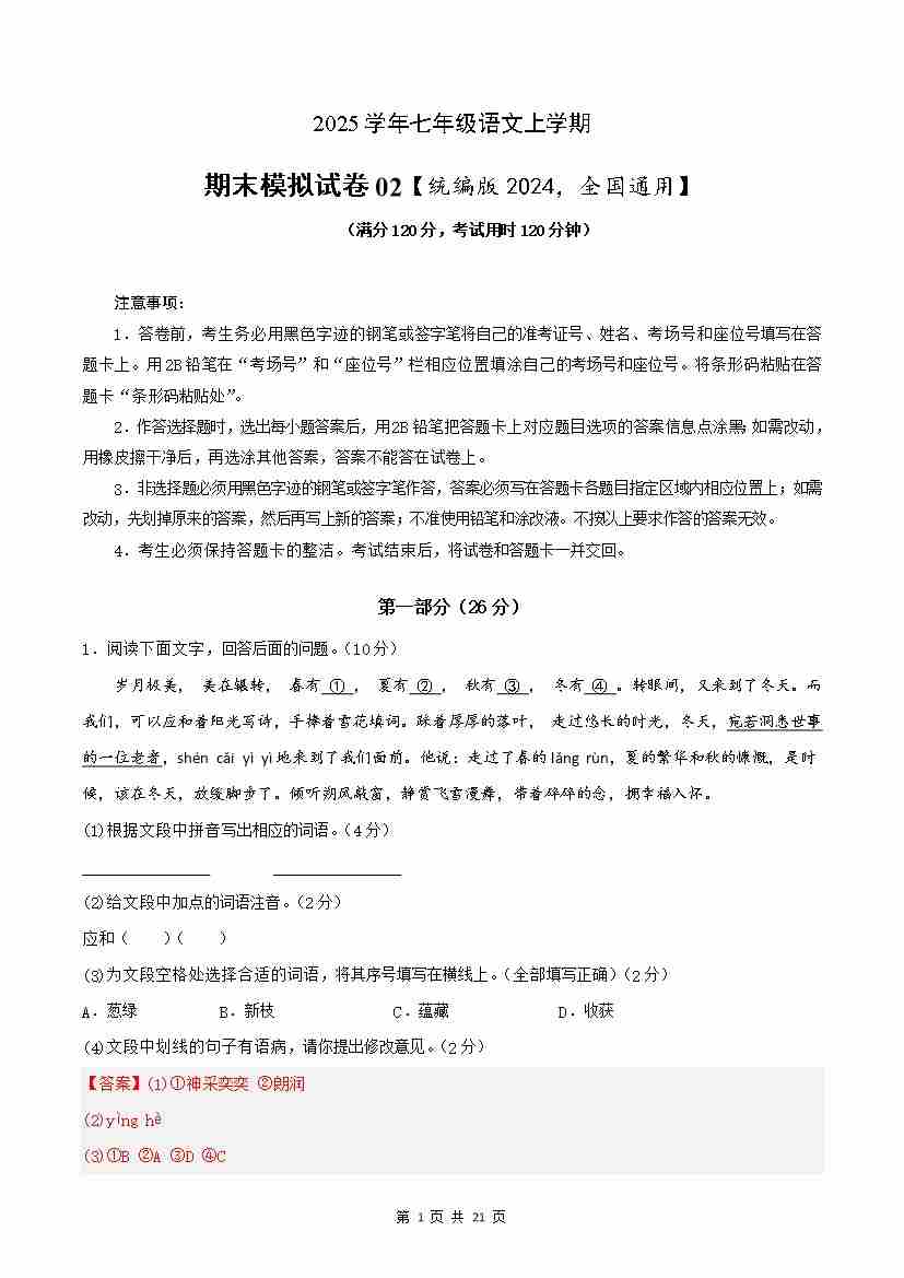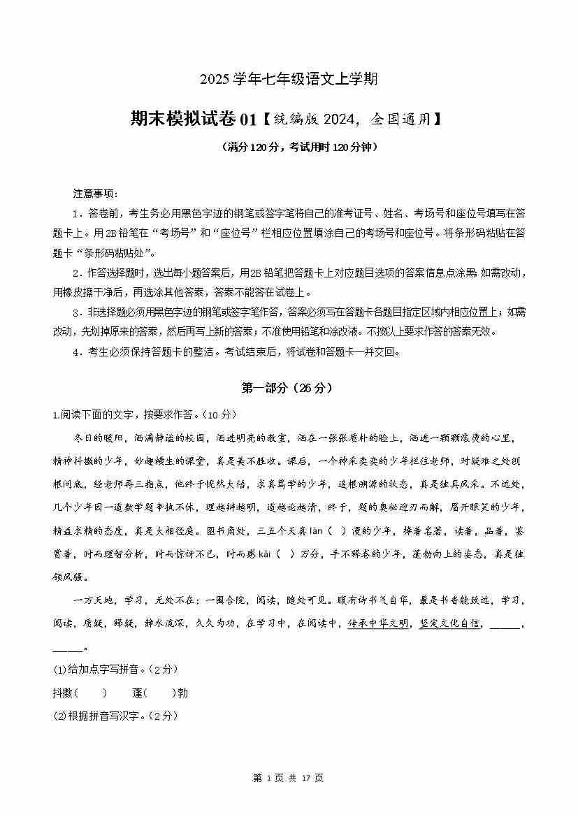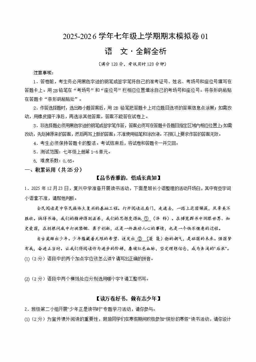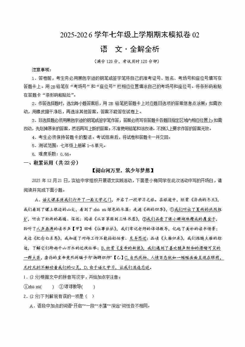 2025--2026学年七年级上学期期末模拟测试语文(一)(全国)试卷及答案44