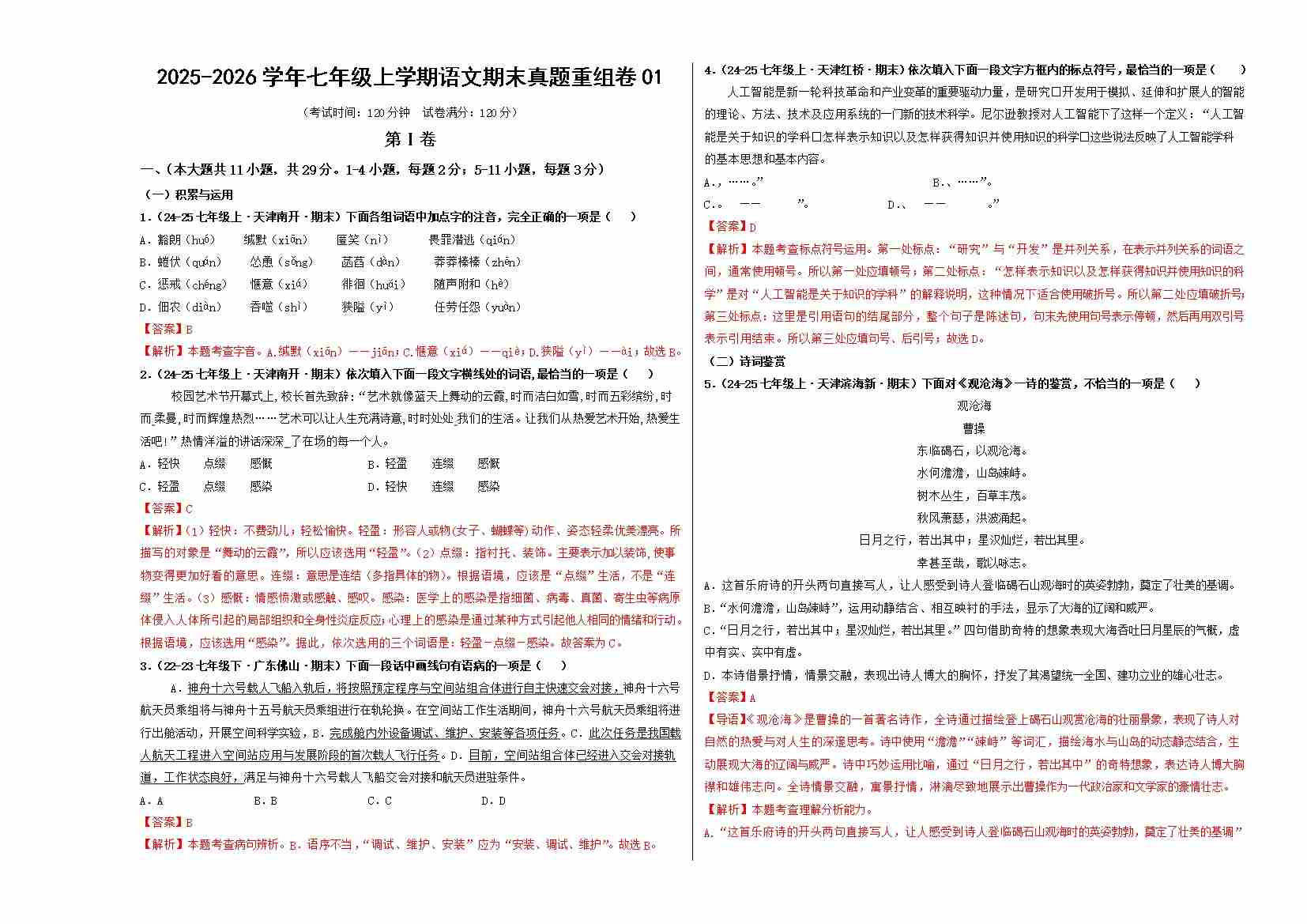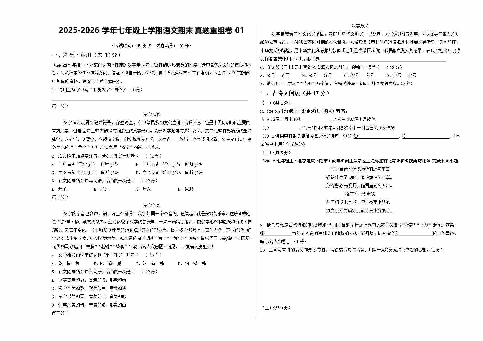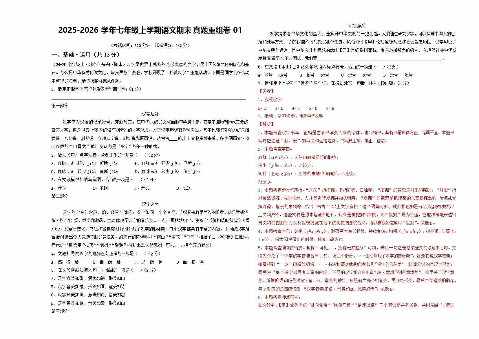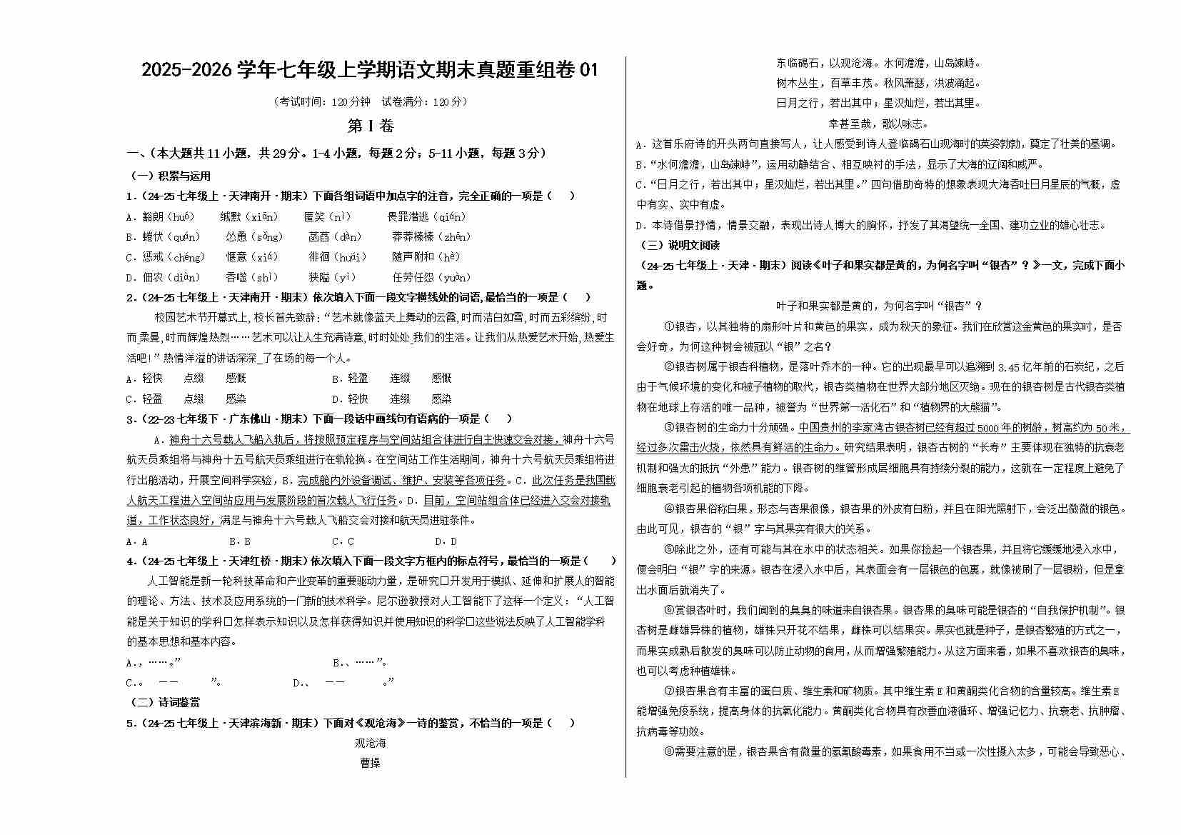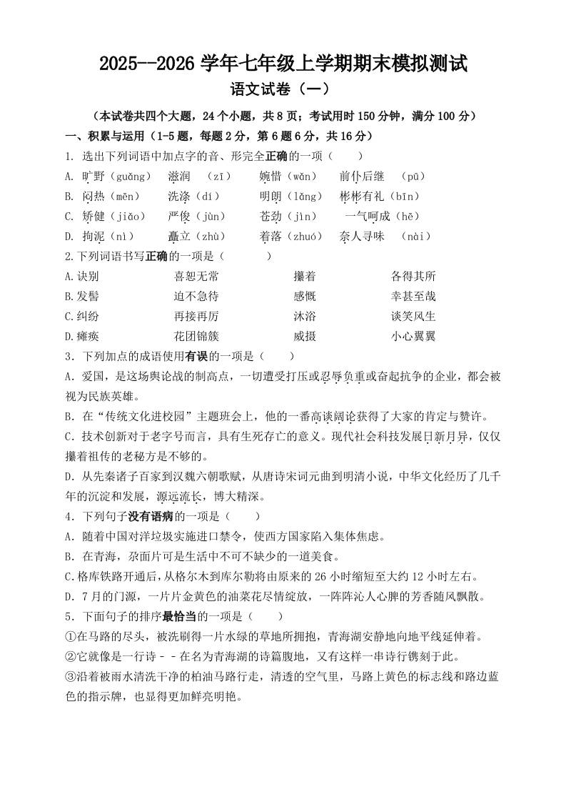 2025--2026学年七年级上学期期末模拟测试语文(一)(全国)试卷及答案44