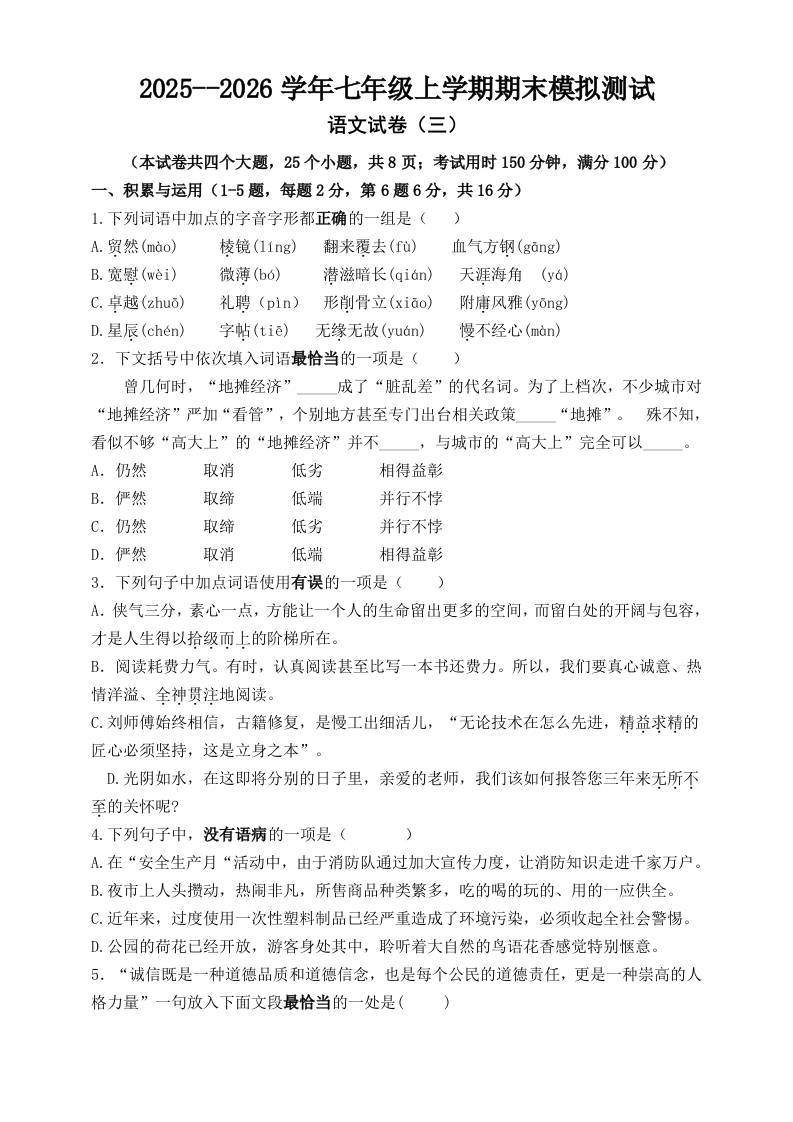 2025--2026学年七年级上学期期末模拟测试语文(三)(全国)试卷及答案22