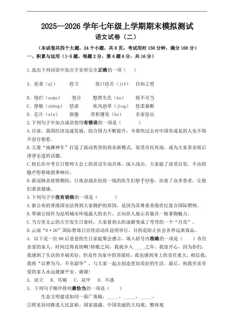 2025--2026学年七年级上学期期末模拟测试语文(二)(全国)试卷及答案11