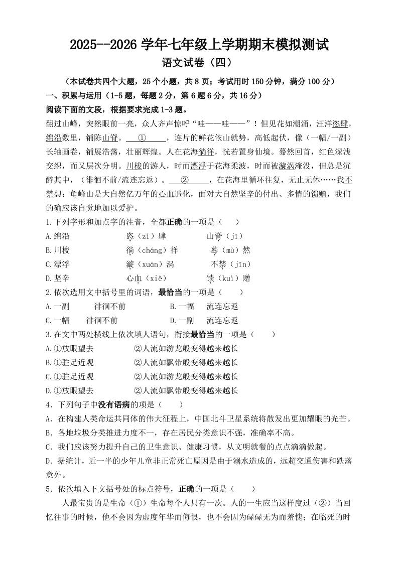2025--2026学年七年级上学期期末模拟测试语文(四)(全国)试卷及答案33