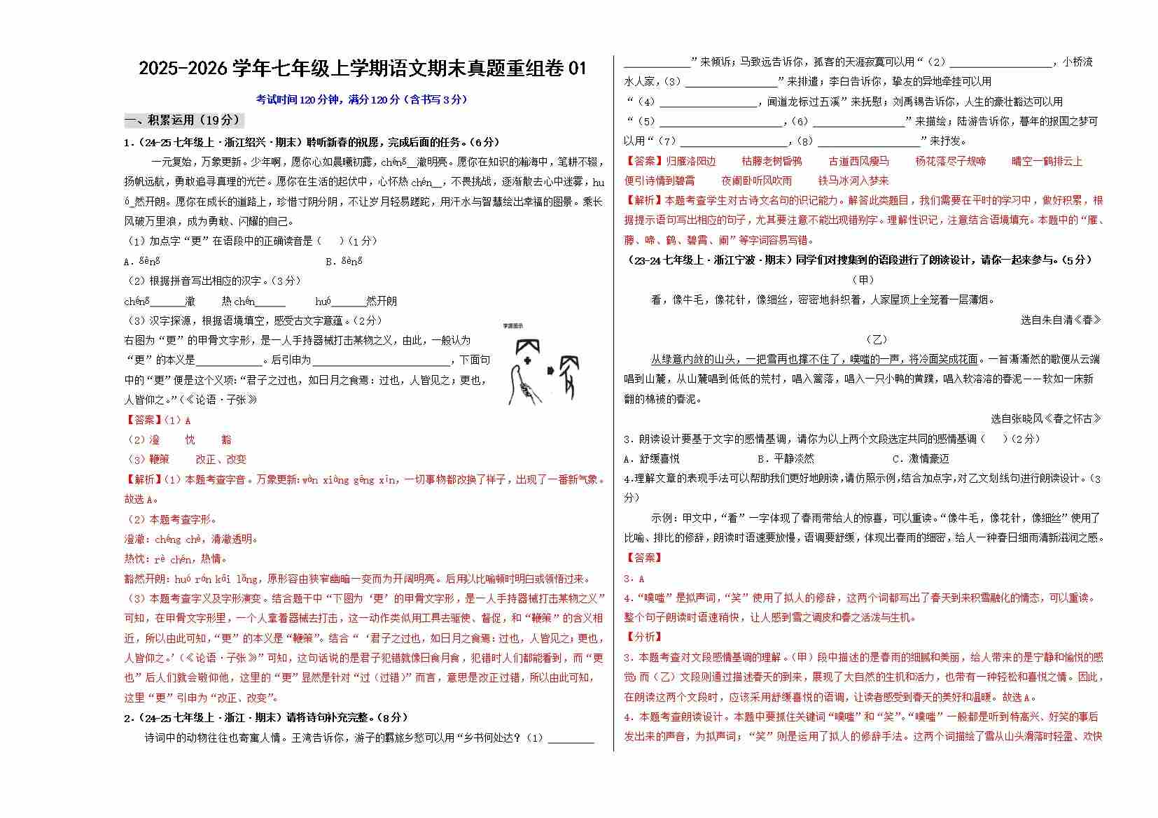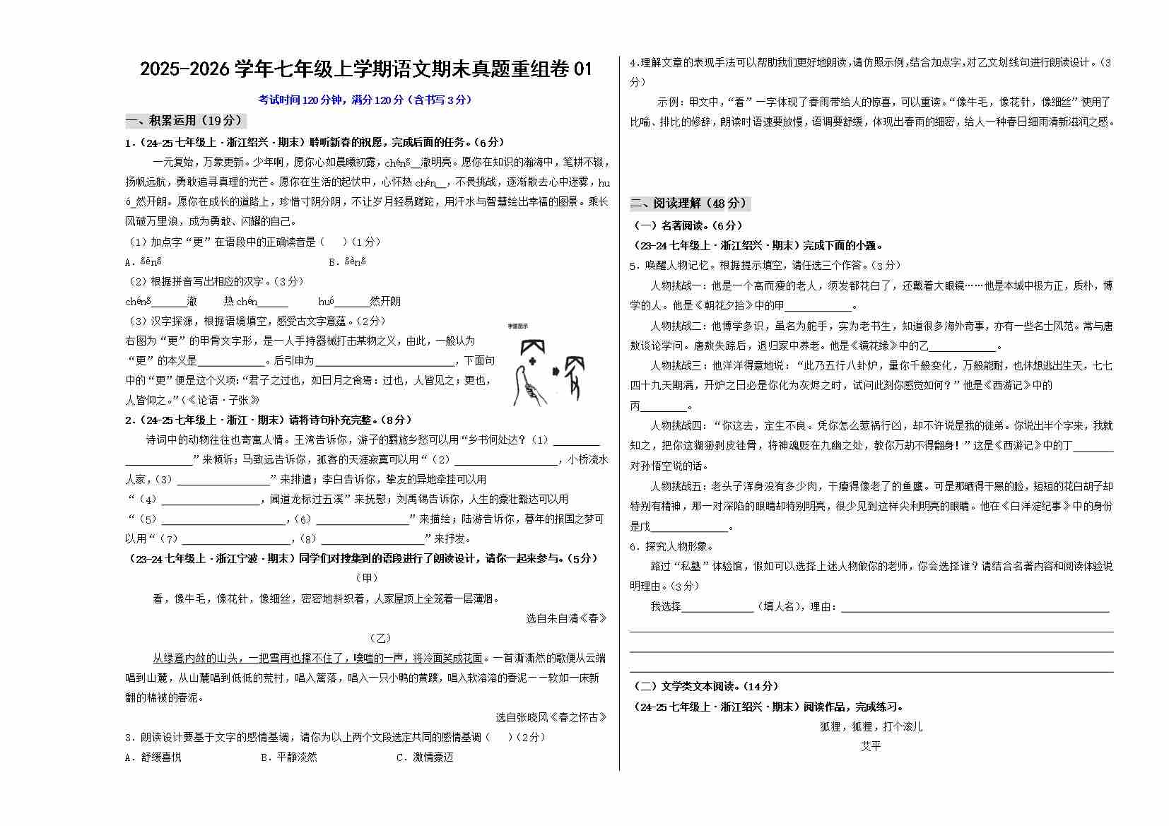 七上语文浙江专用期末真题重组卷01(原卷版)