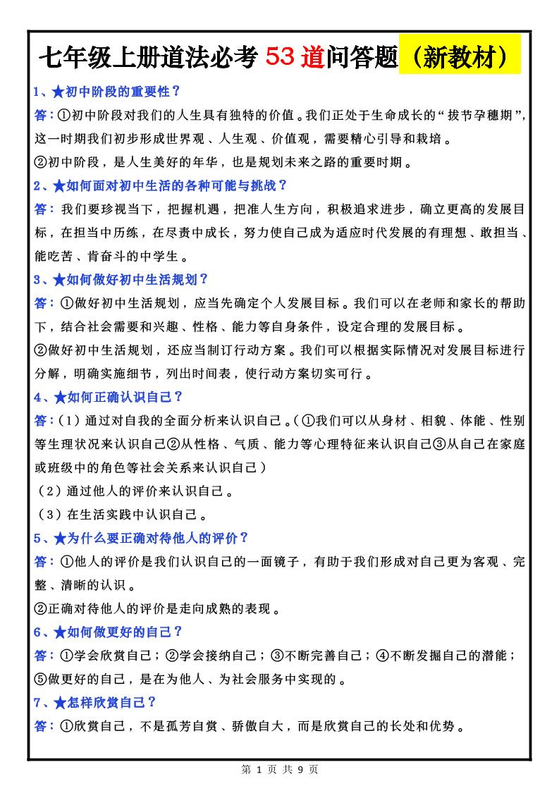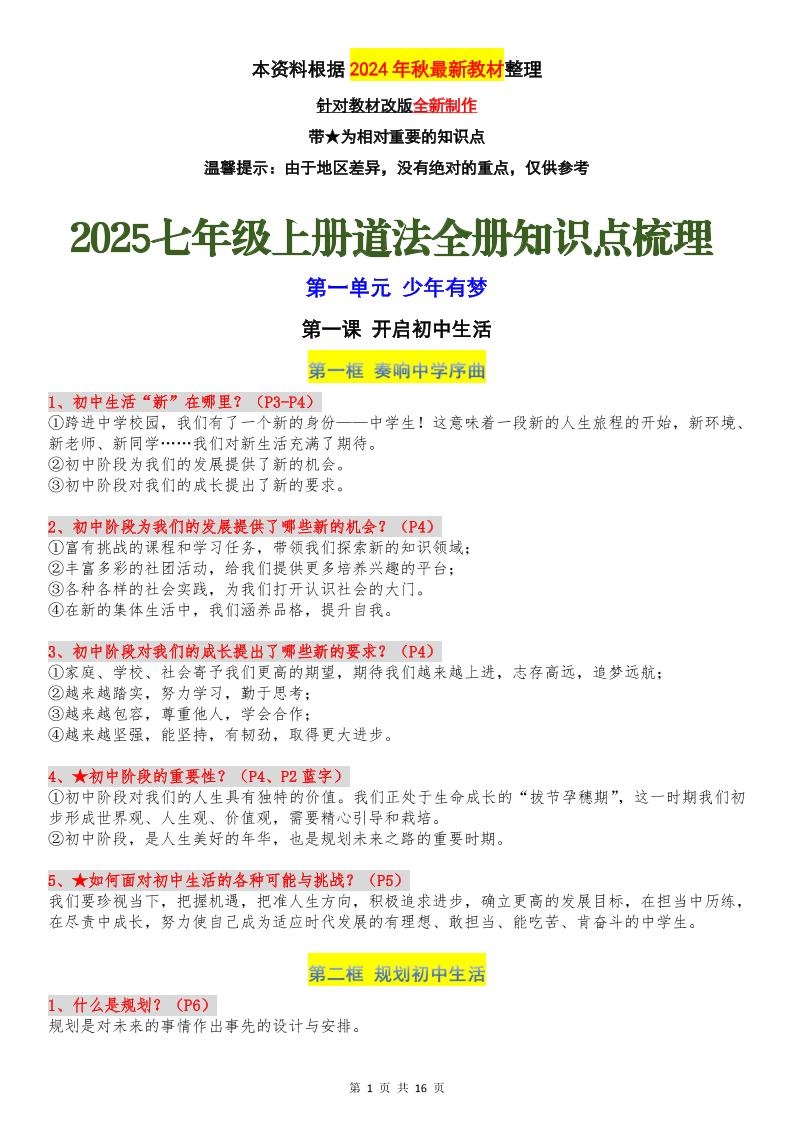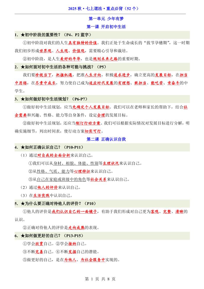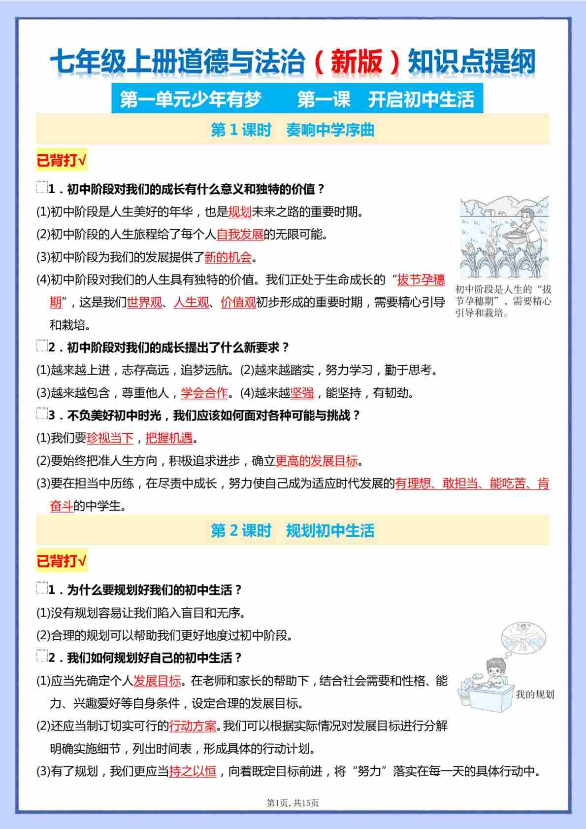 七年级上册道德与法治(新版)知识点提纲(答案)
