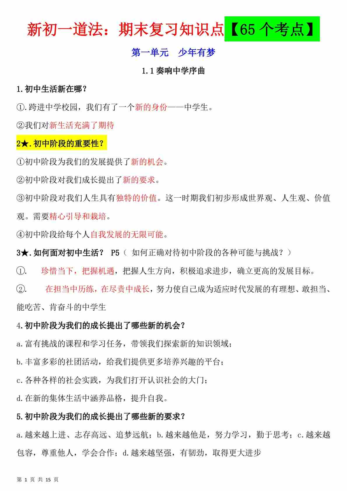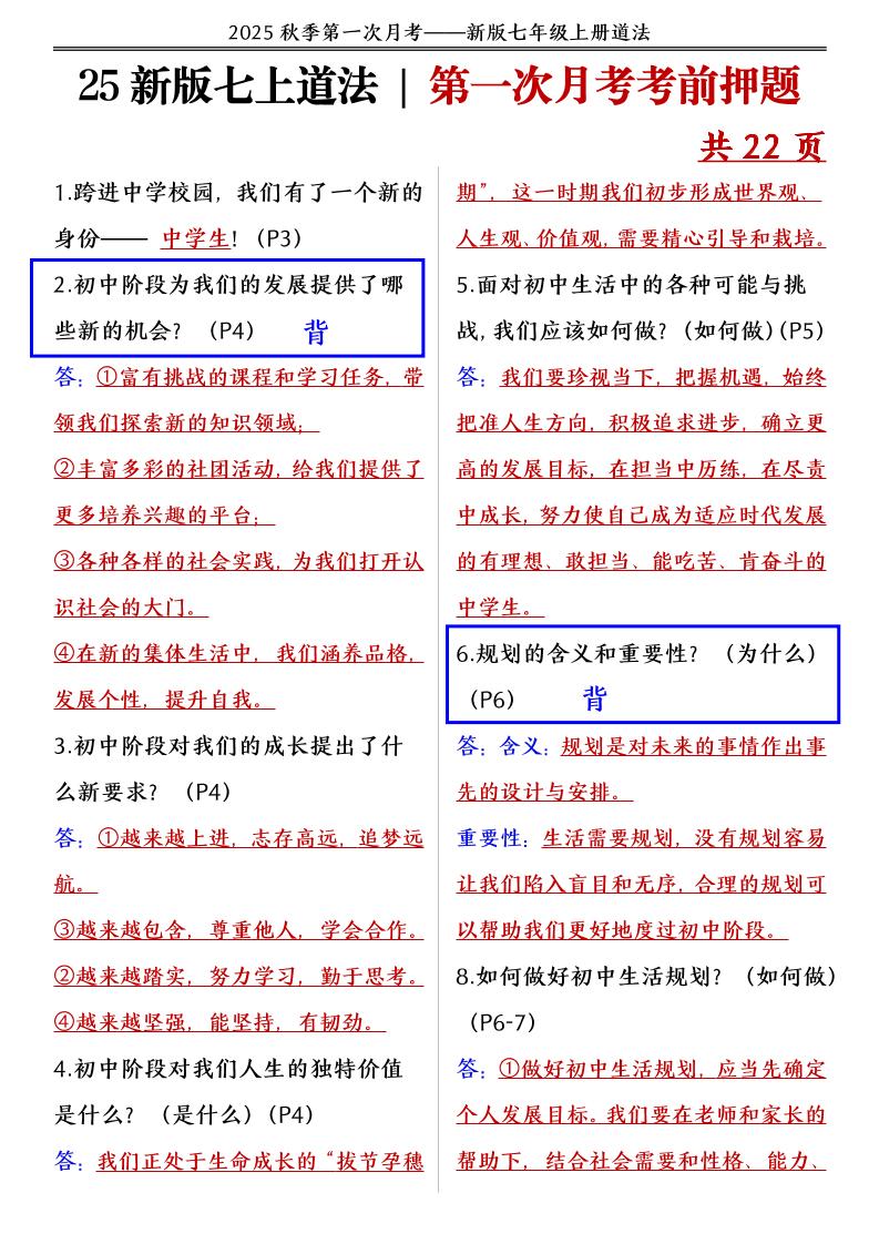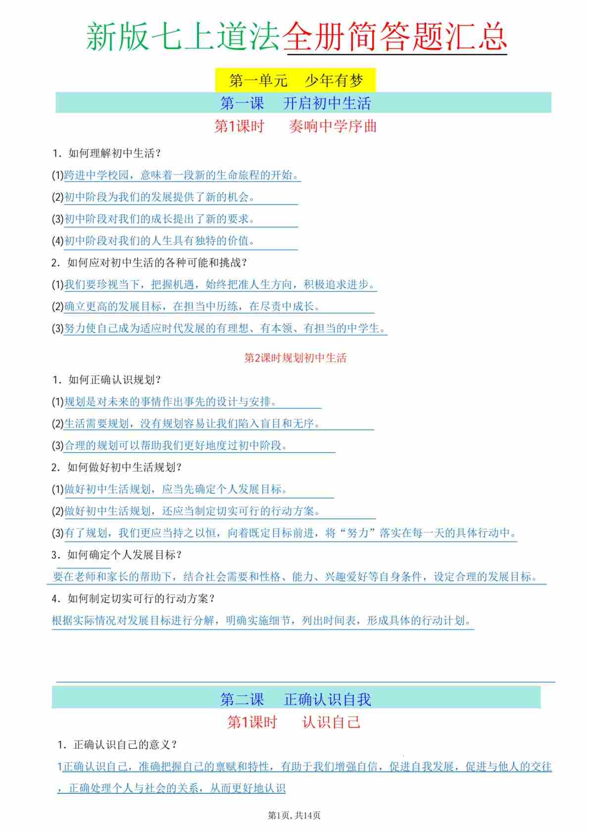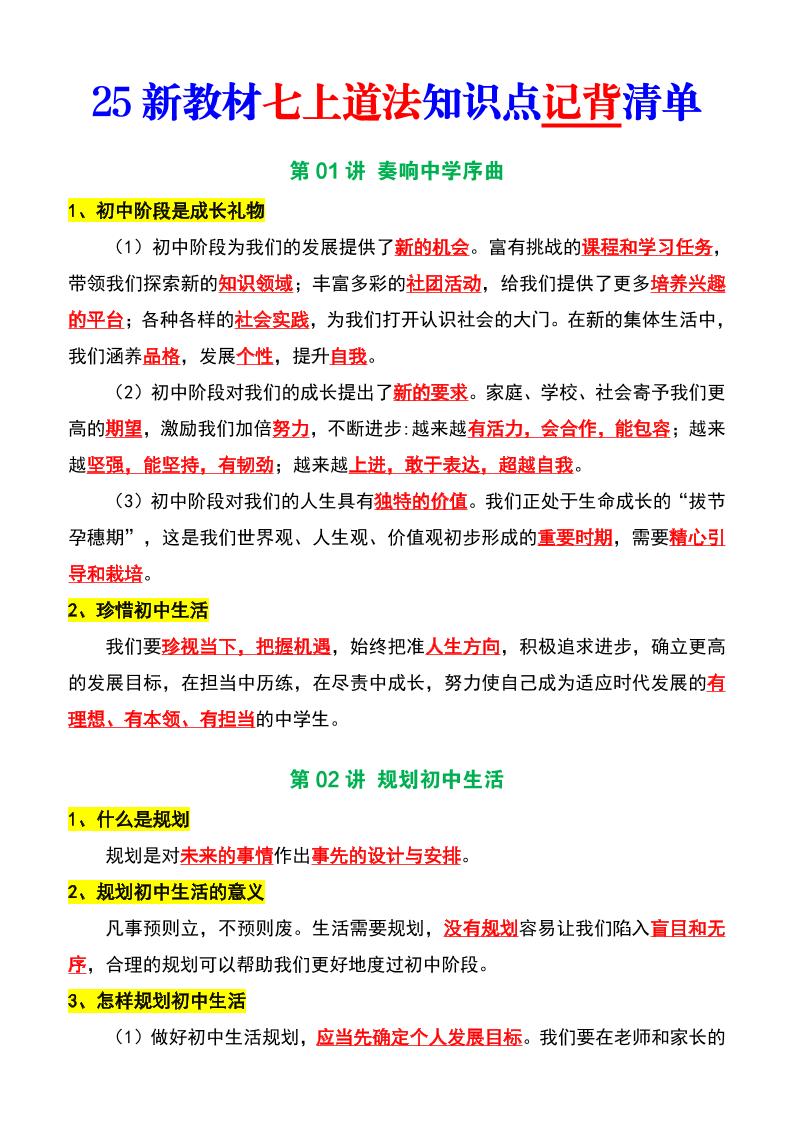七年级上册道德与法治(新版)知识点提纲(答案)