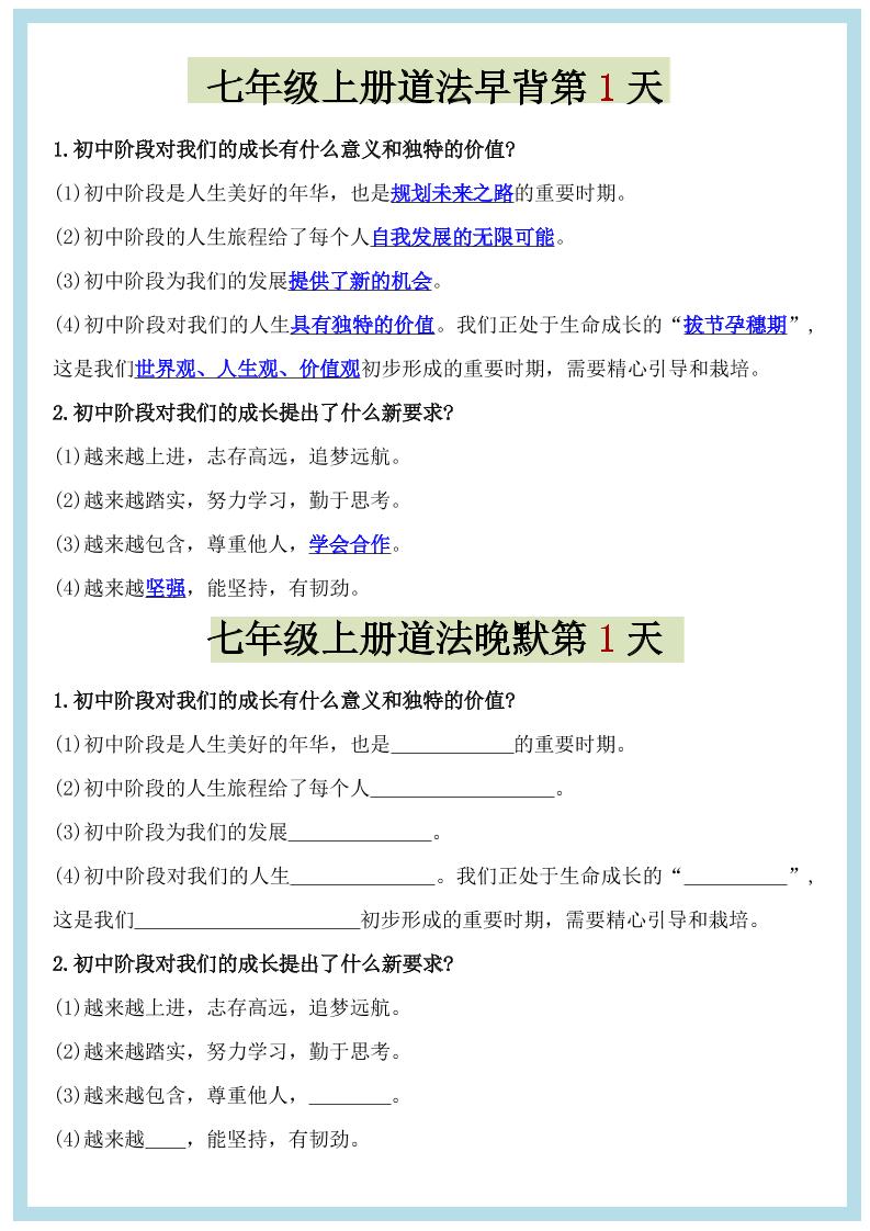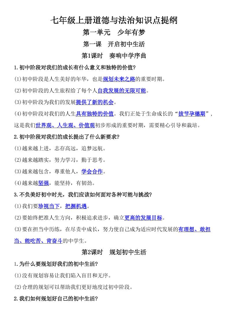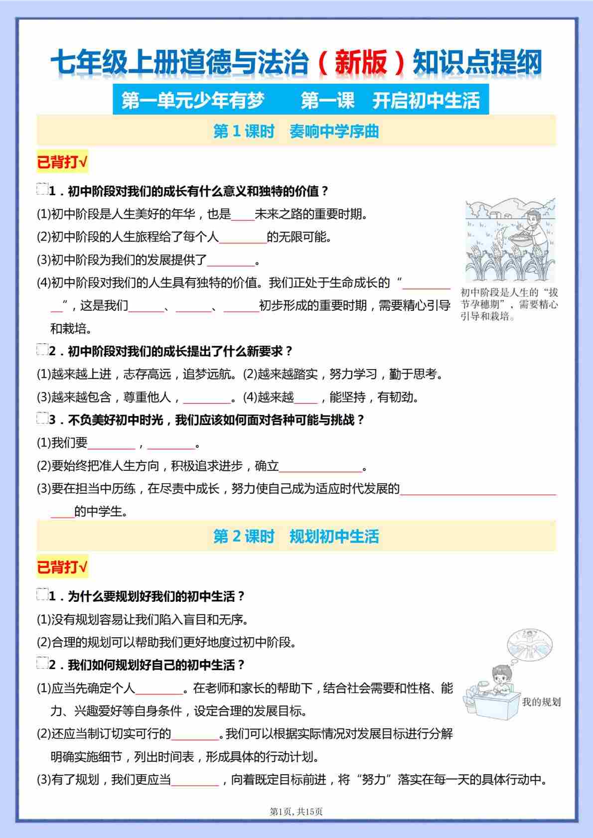 七年级上册道德与法治(新版)知识点提纲(填空)