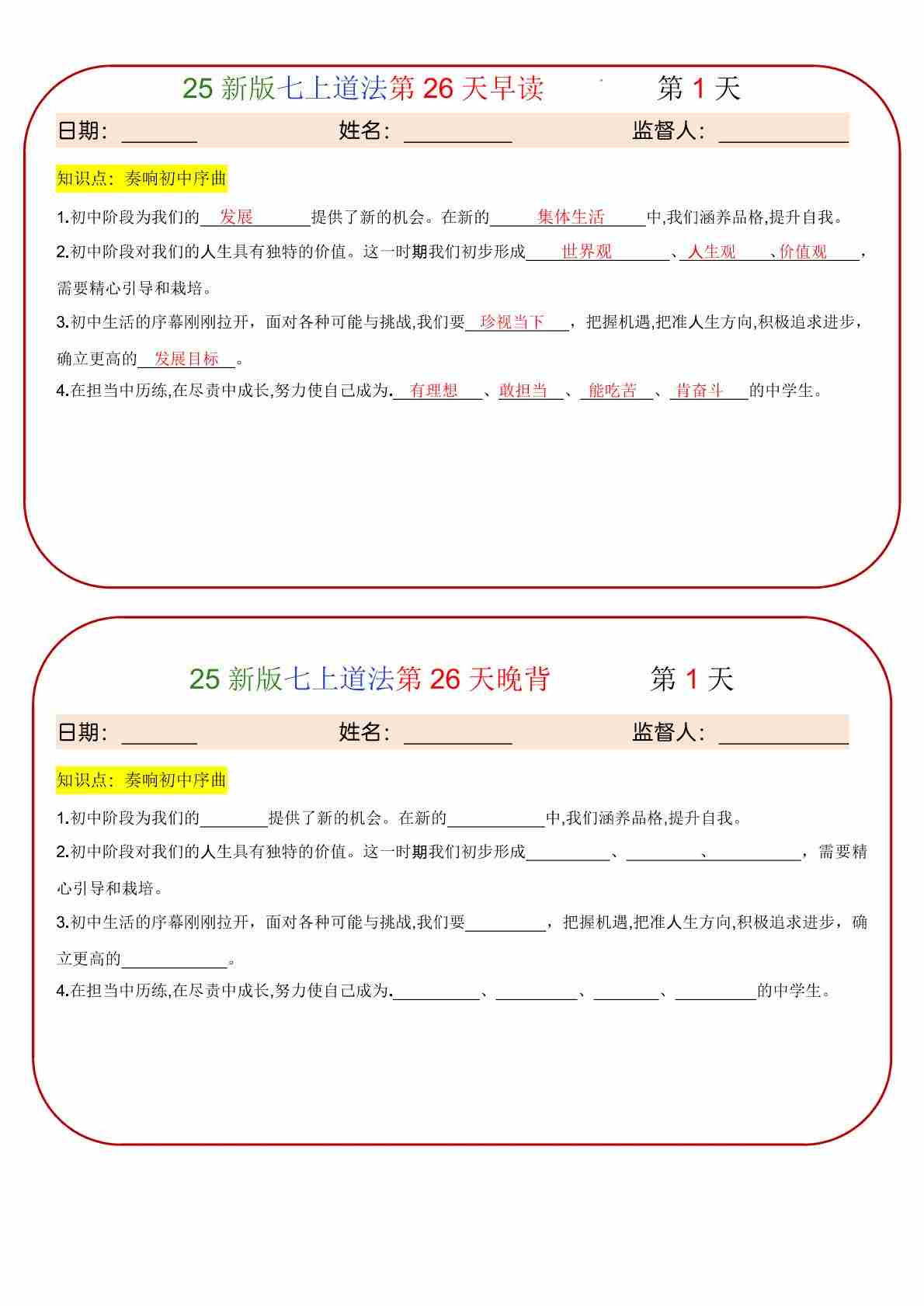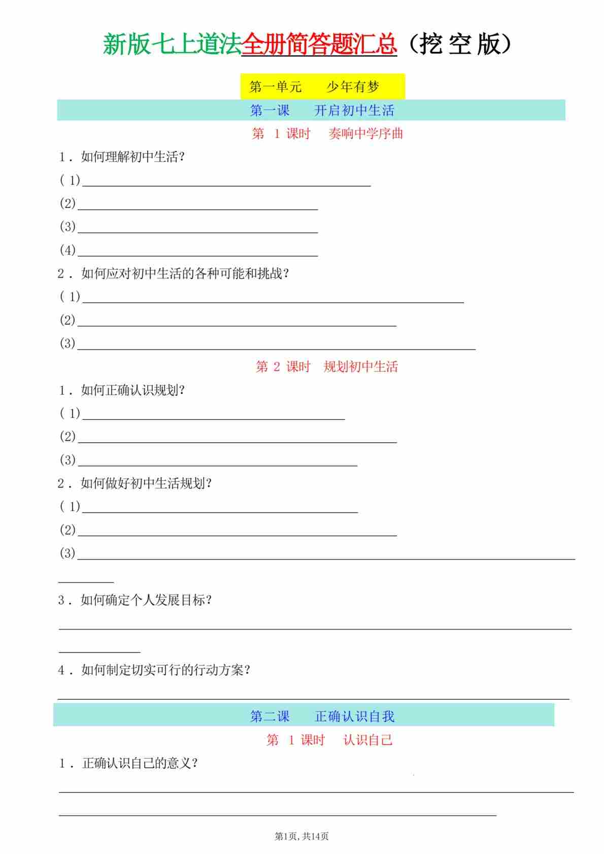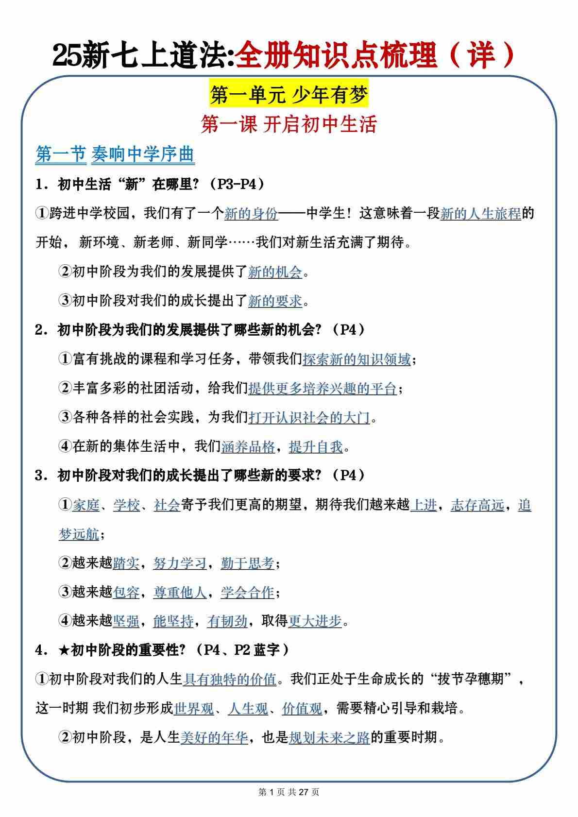 七年级上册道德与法治(新版)知识点提纲(填空)