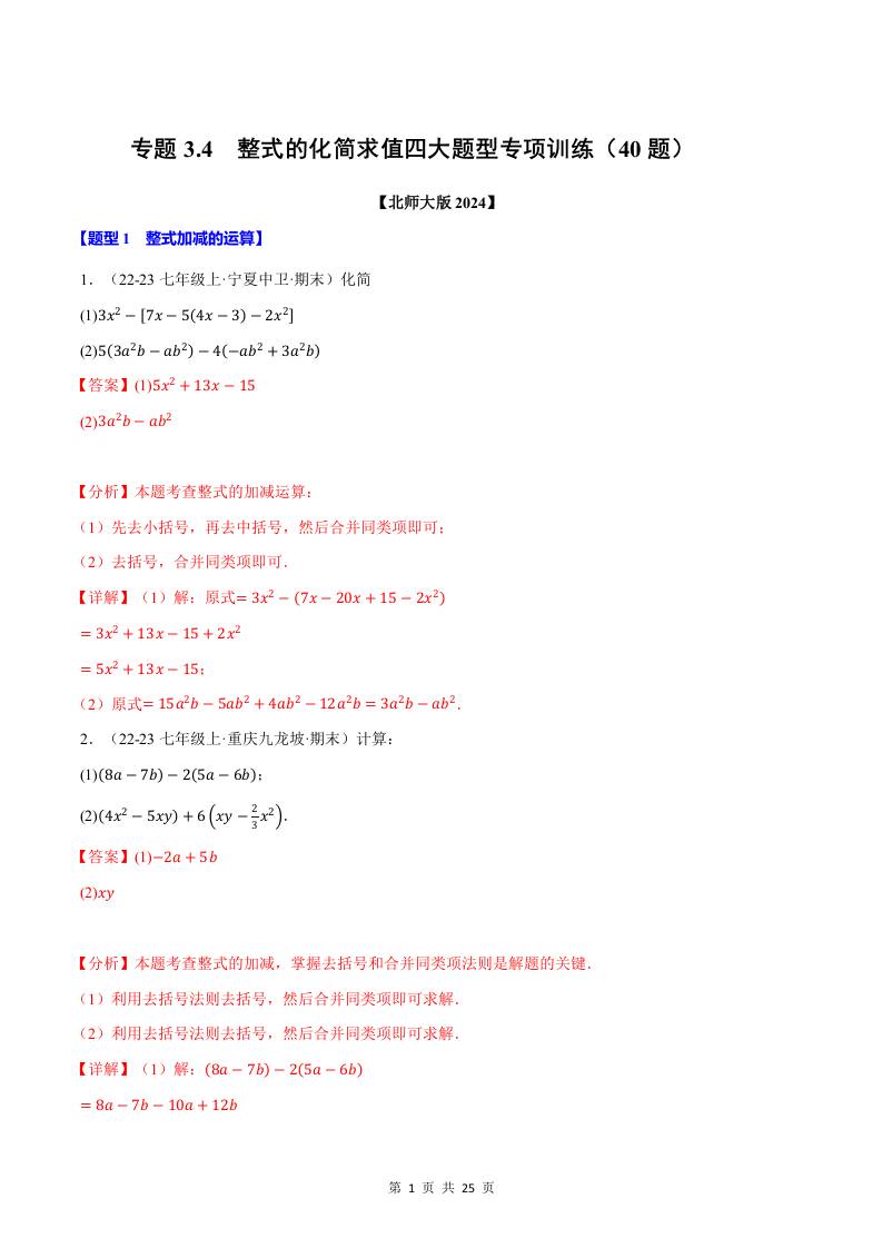专题3.4 整式的化简求值四大题型专项训练(40题)(解析版)