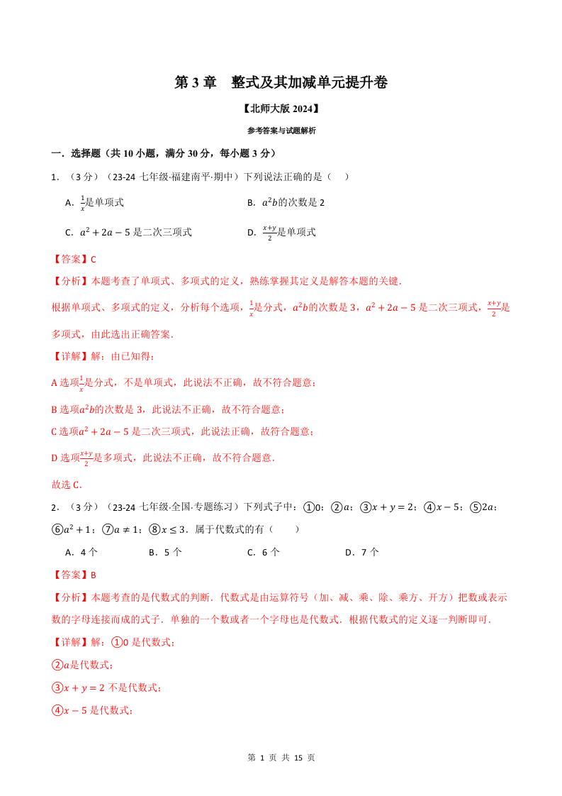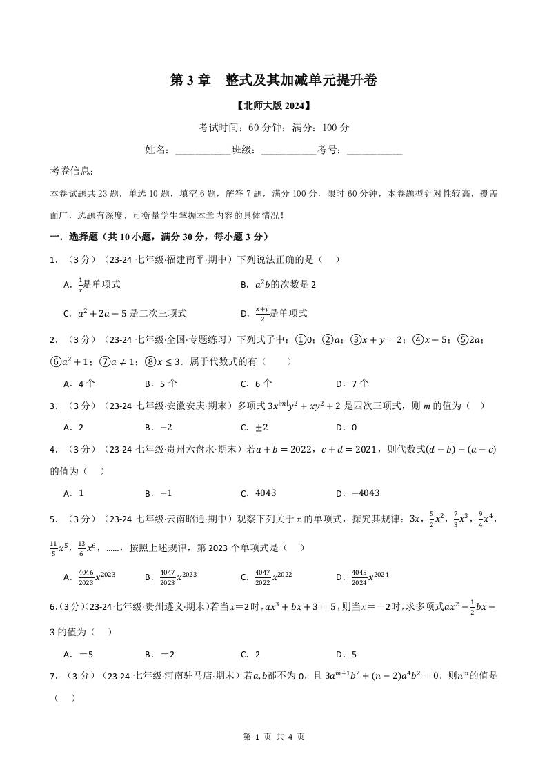 专题3.7 整式及其加减单元提升卷(原卷版)