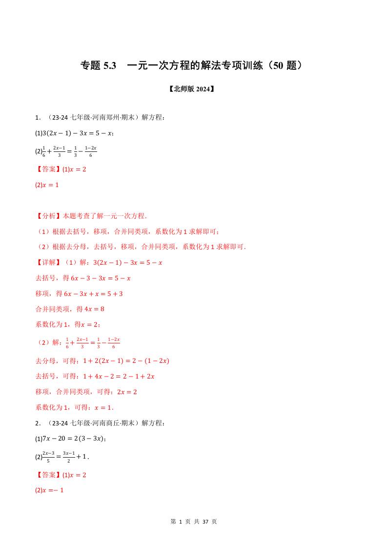 专题5.3 一元一次方程的解法专项训练(50题)(解析版)