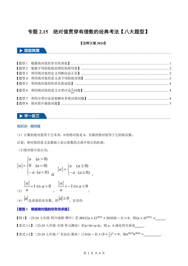 专题2.15 绝对值贯穿有理数的经典考法【八大题型】(原卷版)