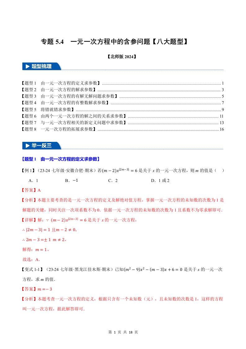 专题5.4 一元一次方程中的含参问题【八大题型】(解析版)