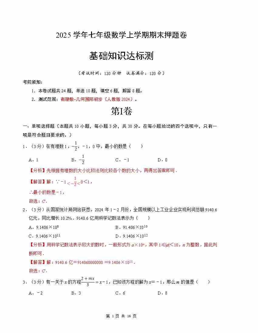 七年级数学人教上册期末模拟试卷(人教版2024,测试范围:第1-6章) 答案