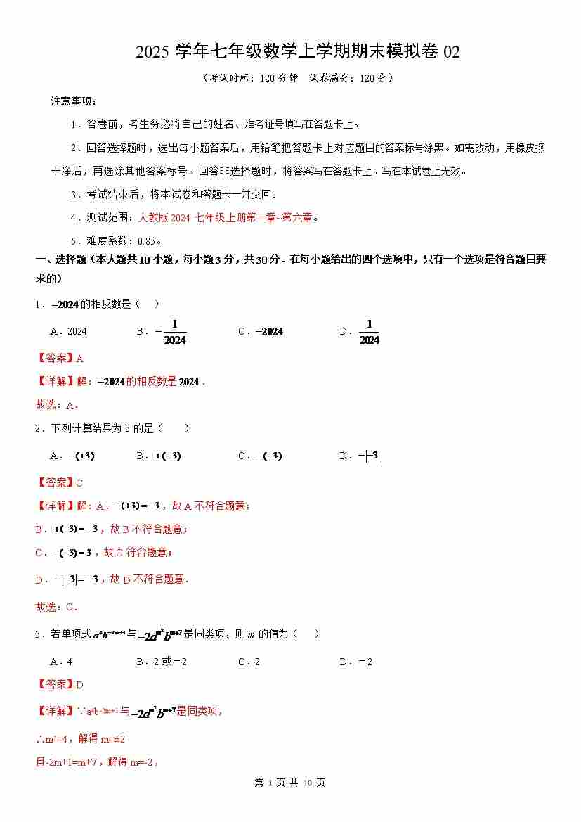 七年级数学人教上册期末模拟试卷02(人教版2024,测试范围:第1-6章) 答案
