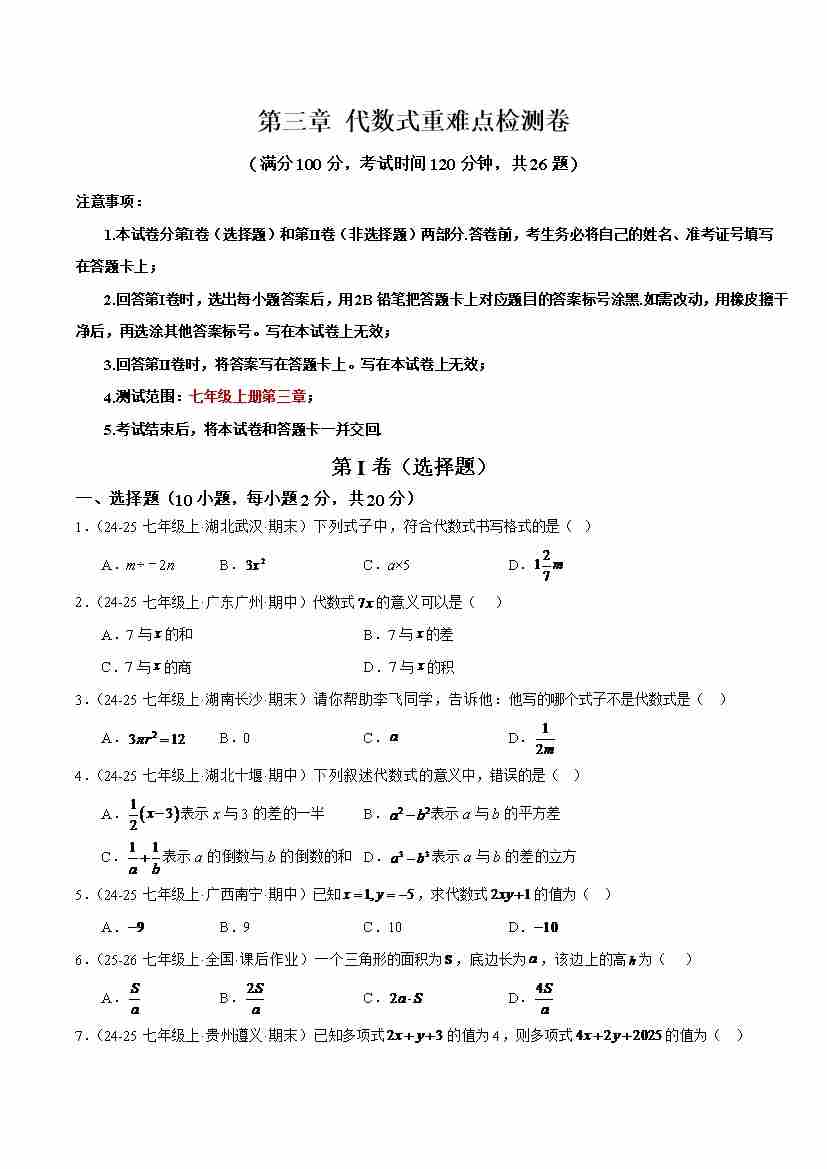 第三章 代数式重难点检测卷(原卷版)