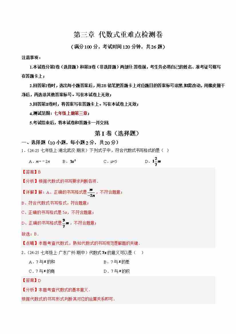 第3章 代数式(单元重点综合测试)(解析版)
