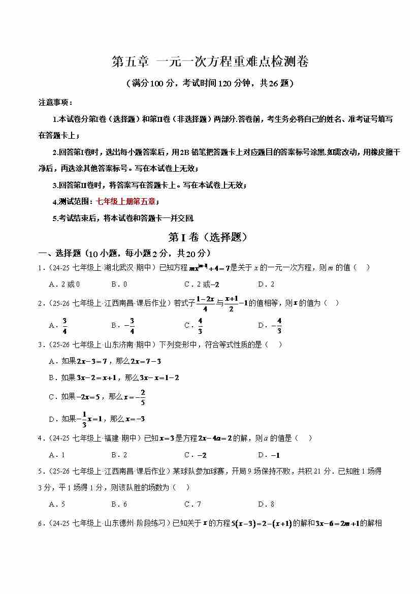 第五章 一元一次方程重难点检测卷(学生版)