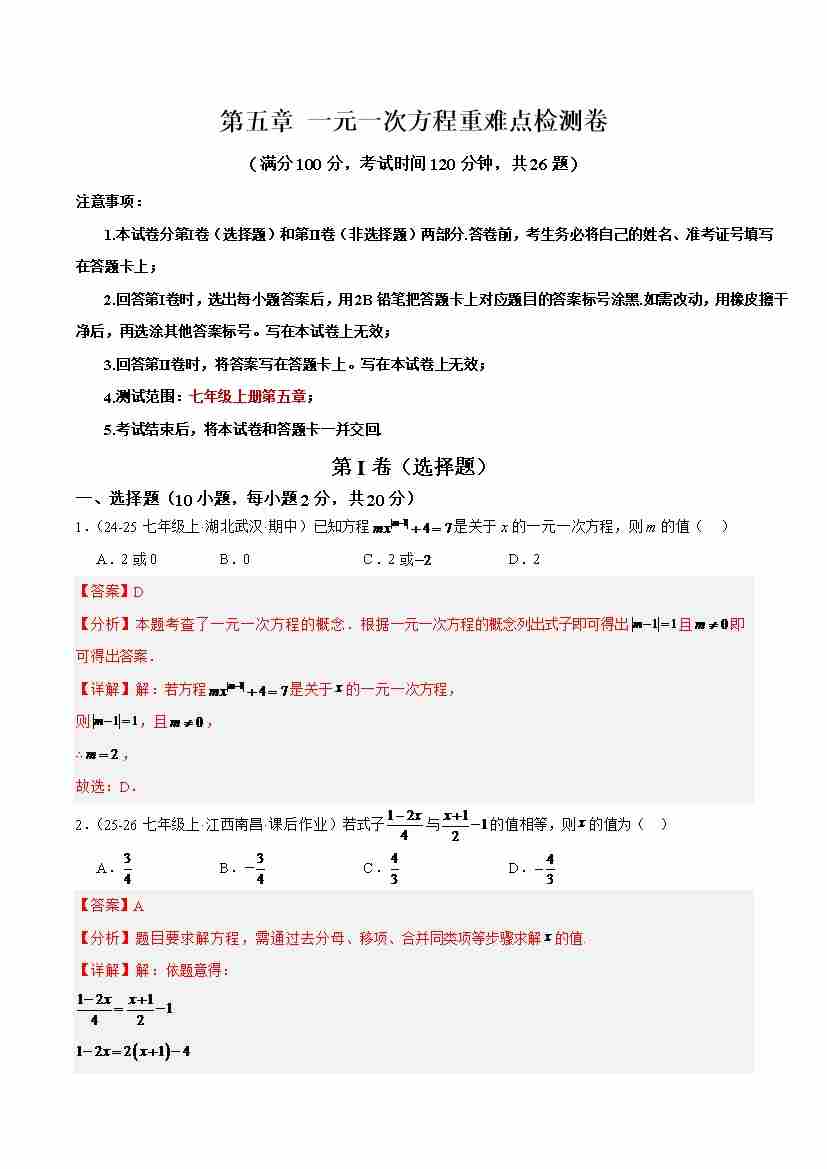第五章 一元一次方程重难点检测卷(教师版)
