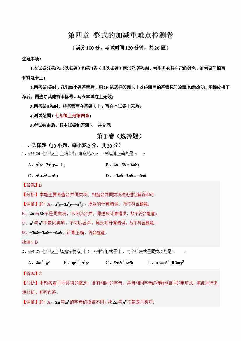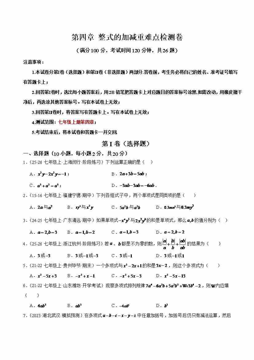 第四章 整式的加减重难点检测卷(学生版)