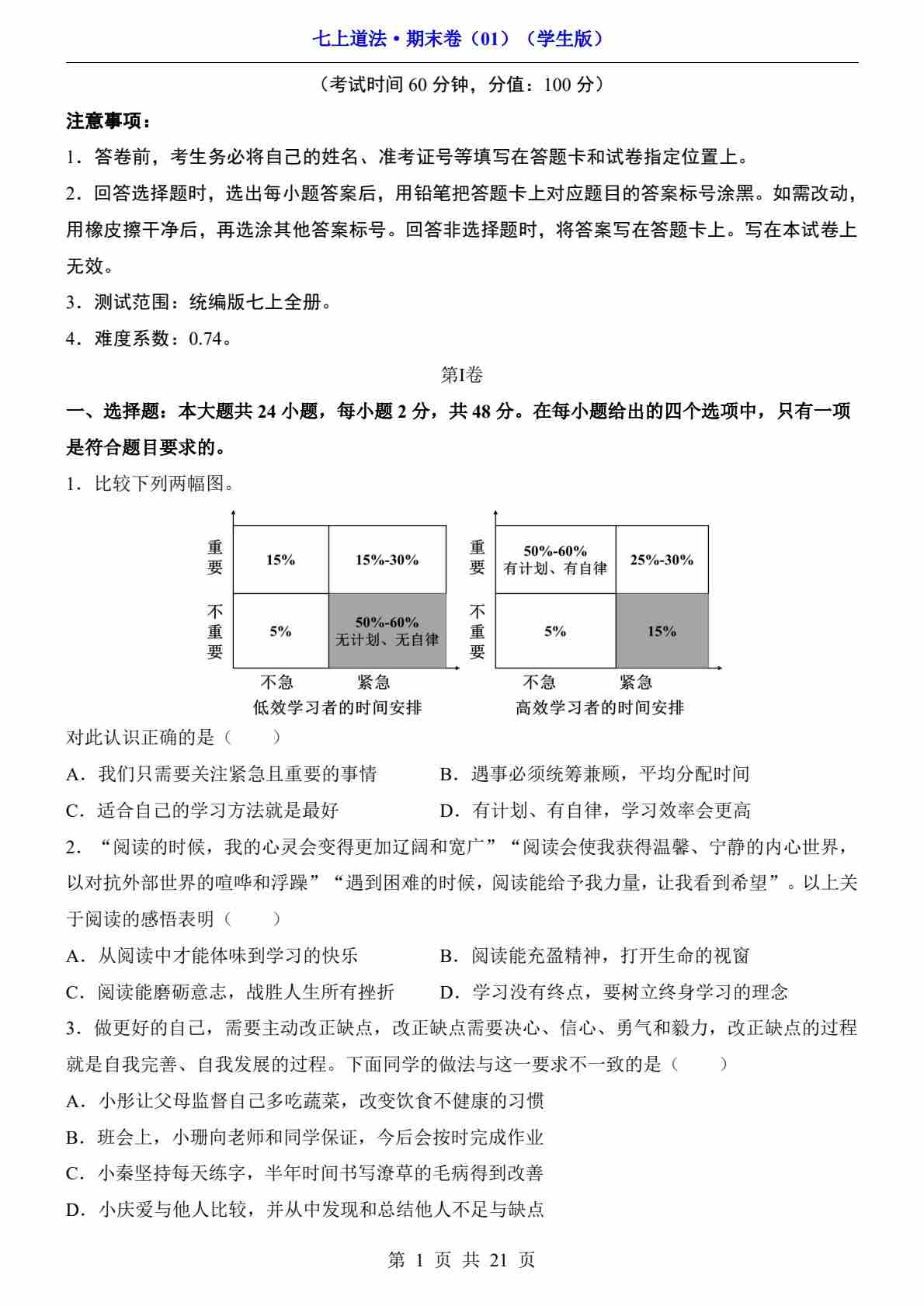 七年级道德与法治上学期期末模拟卷01(统编版新教材)(考试版A4)