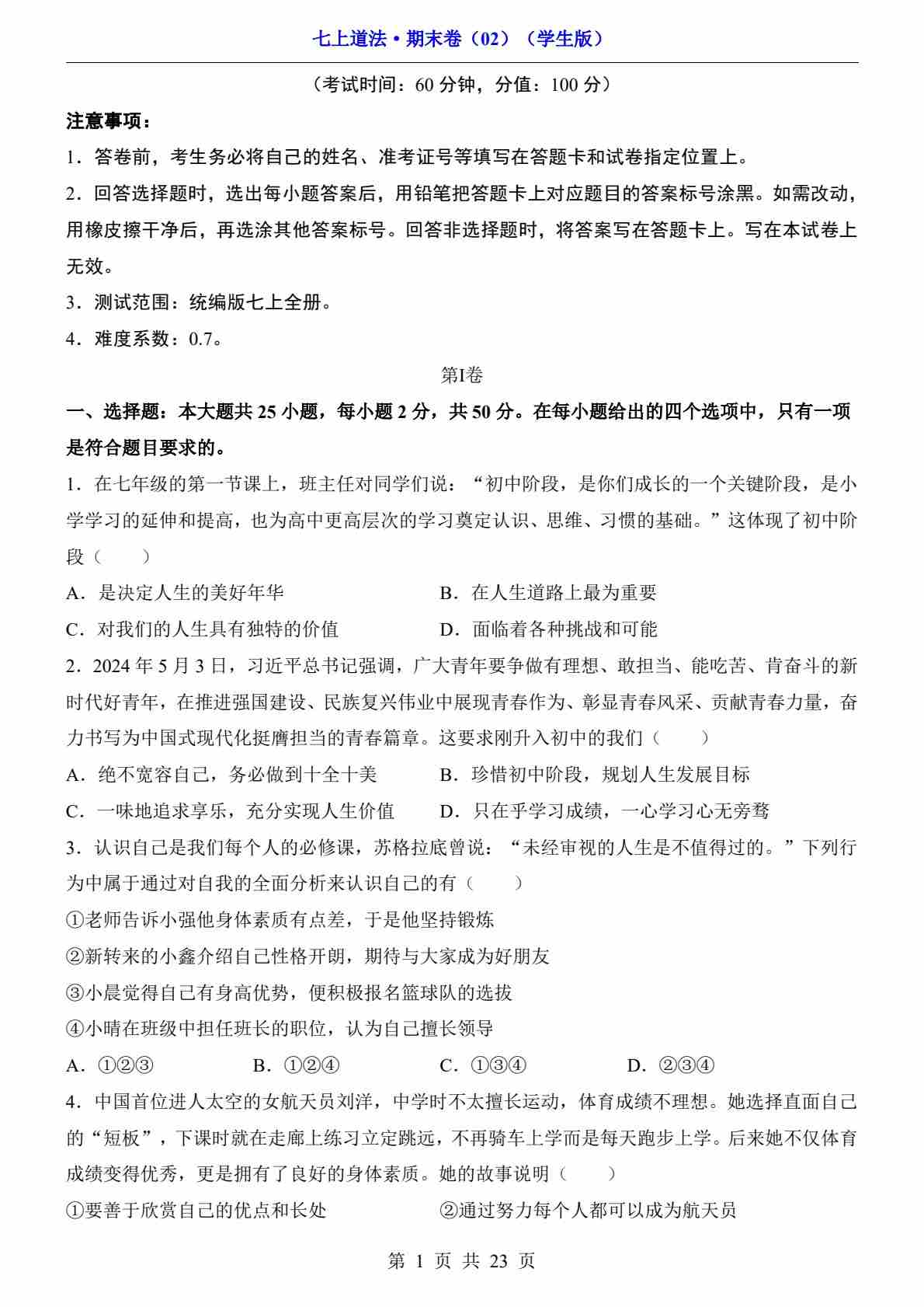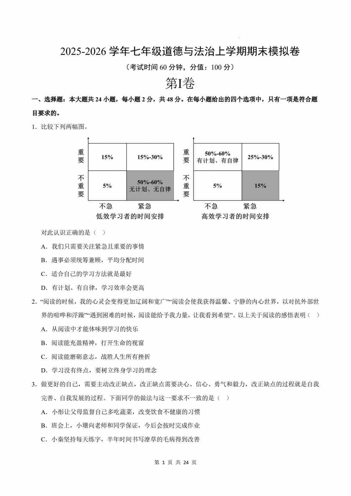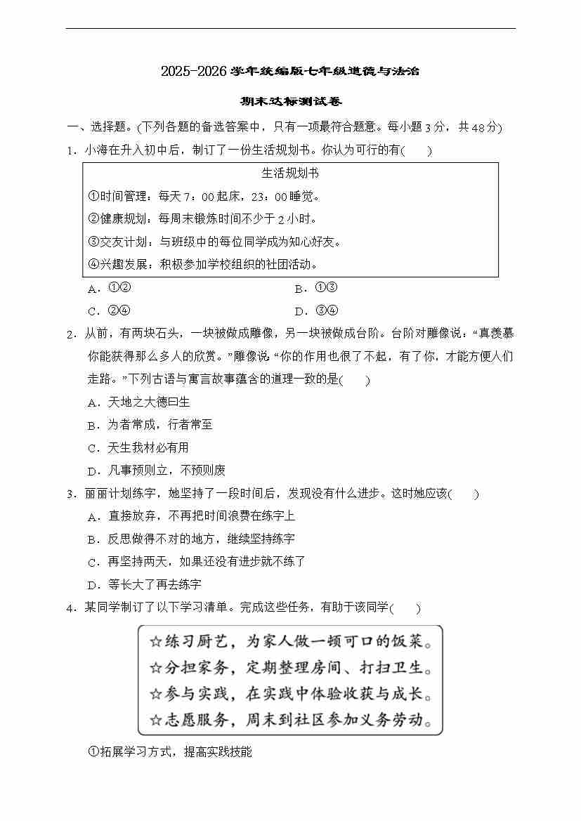 期末复习试卷-2025-2026学年统编版道德与法治七年级上册(1)
