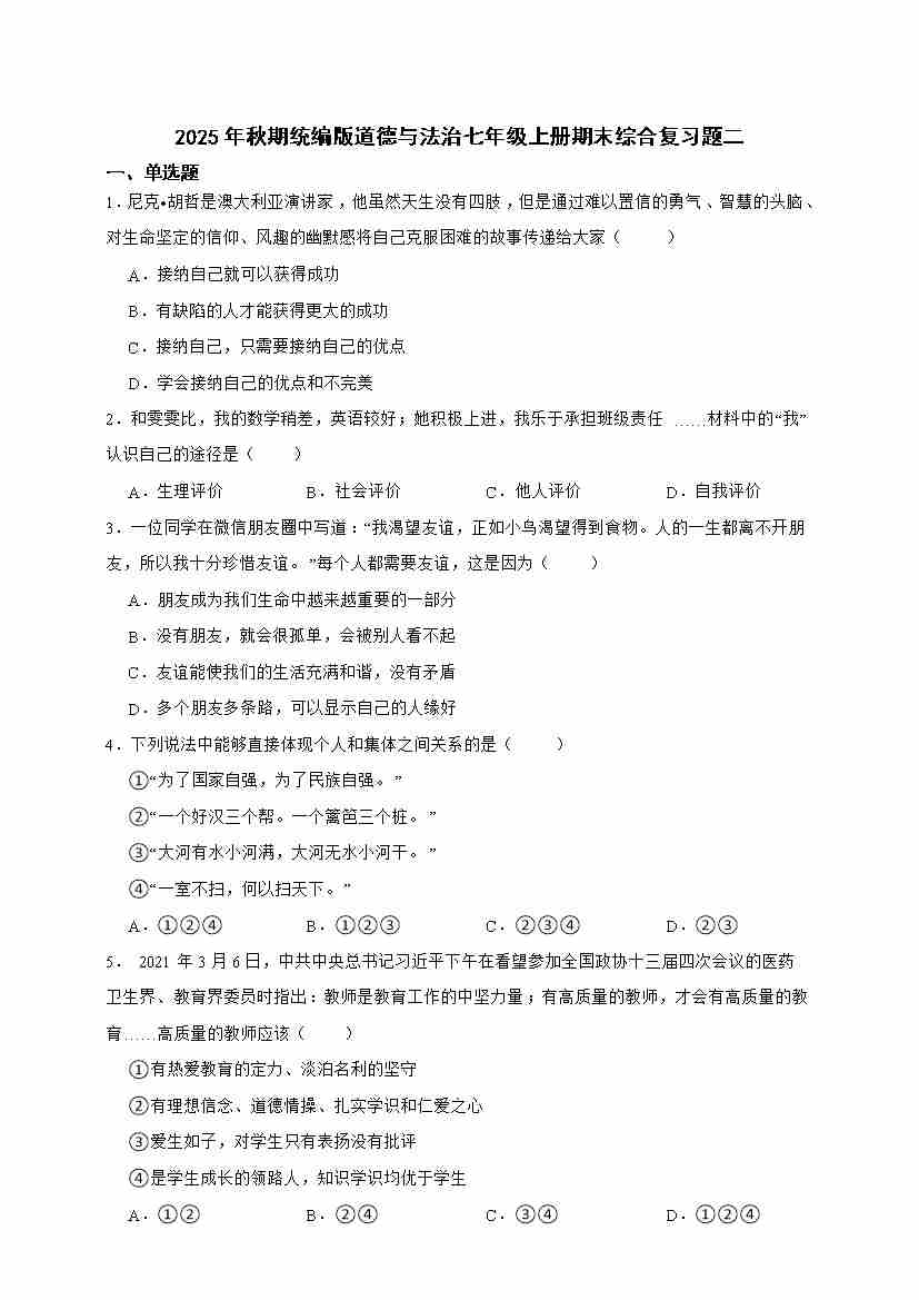 期末综合复习题二(含答案)2025年秋期统编版道德与法治七年级上册..