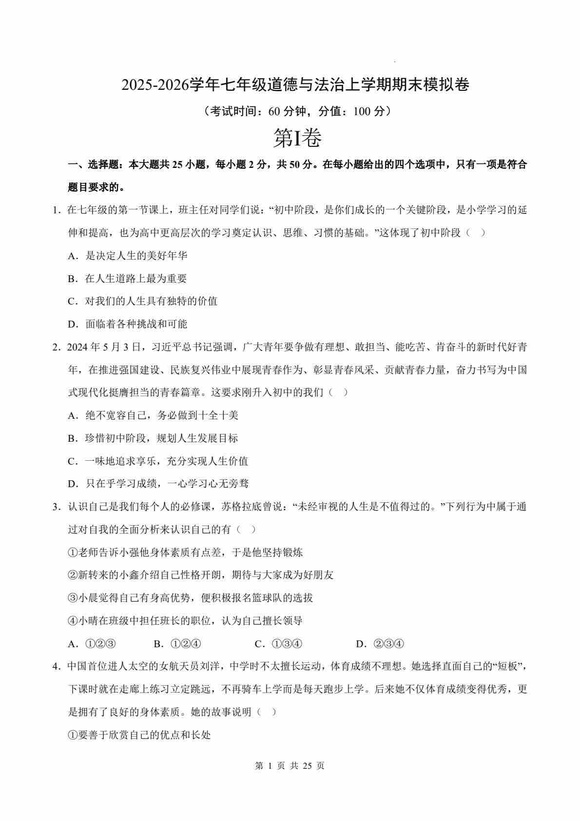 期末模拟考试题-2025-2026学年统编版道德与法治七年级上册