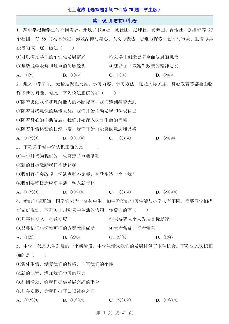 七年级道德与法治期中复习—必刷主观题(36题)(原卷版)