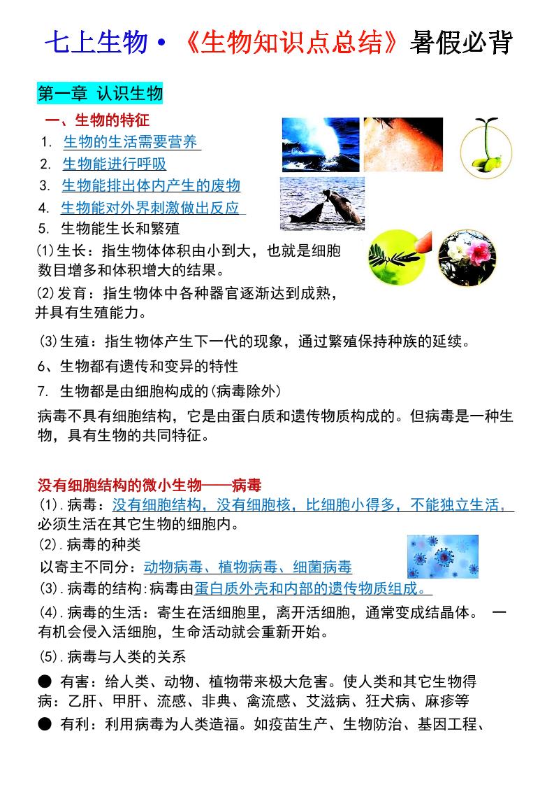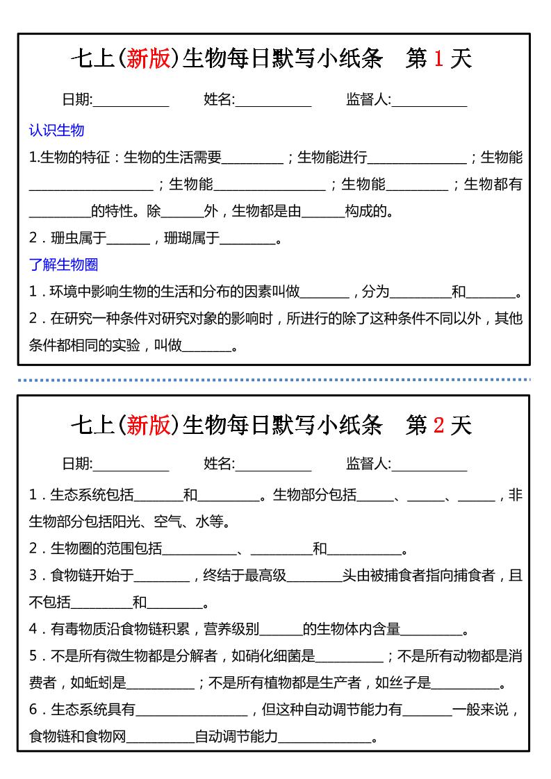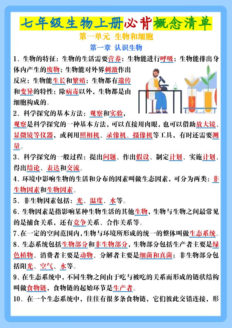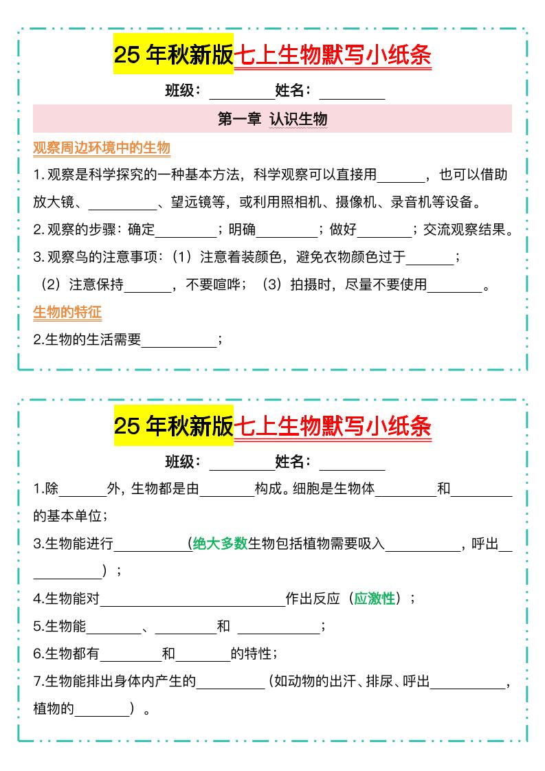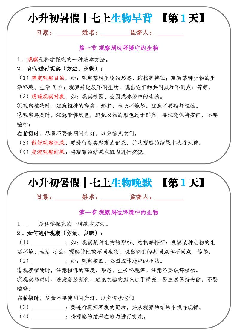 小升初暑假|七上生物早背晚默小纸条(人教版)