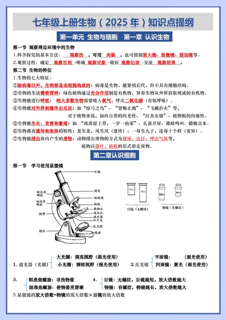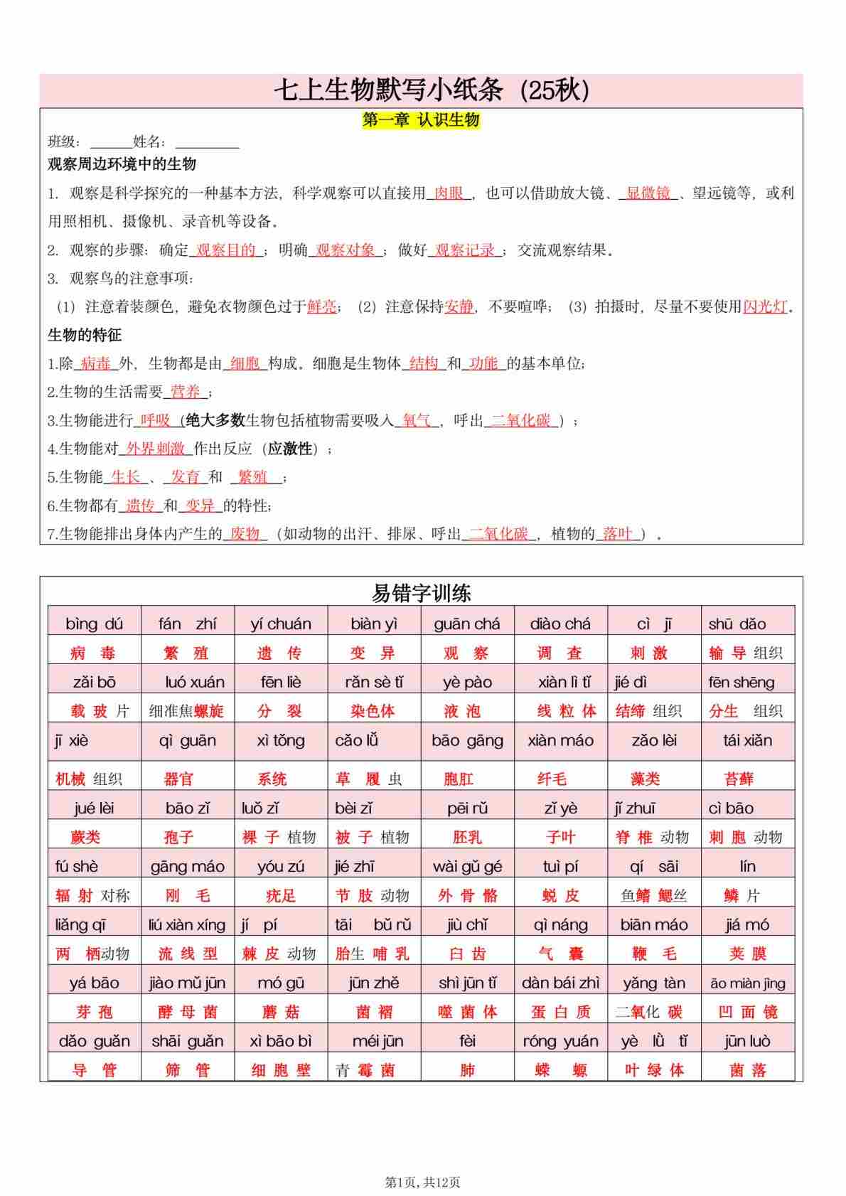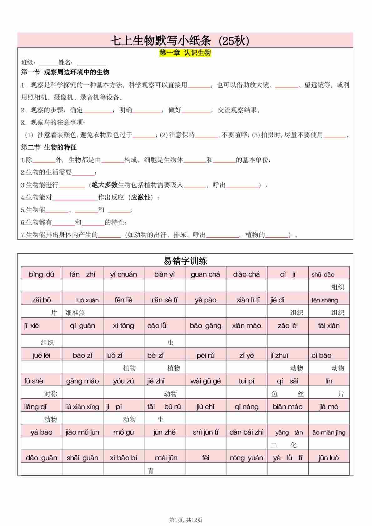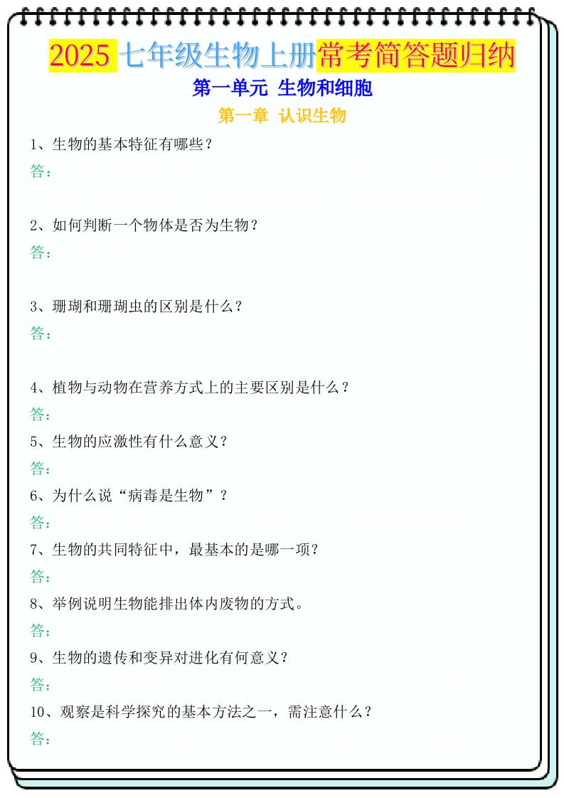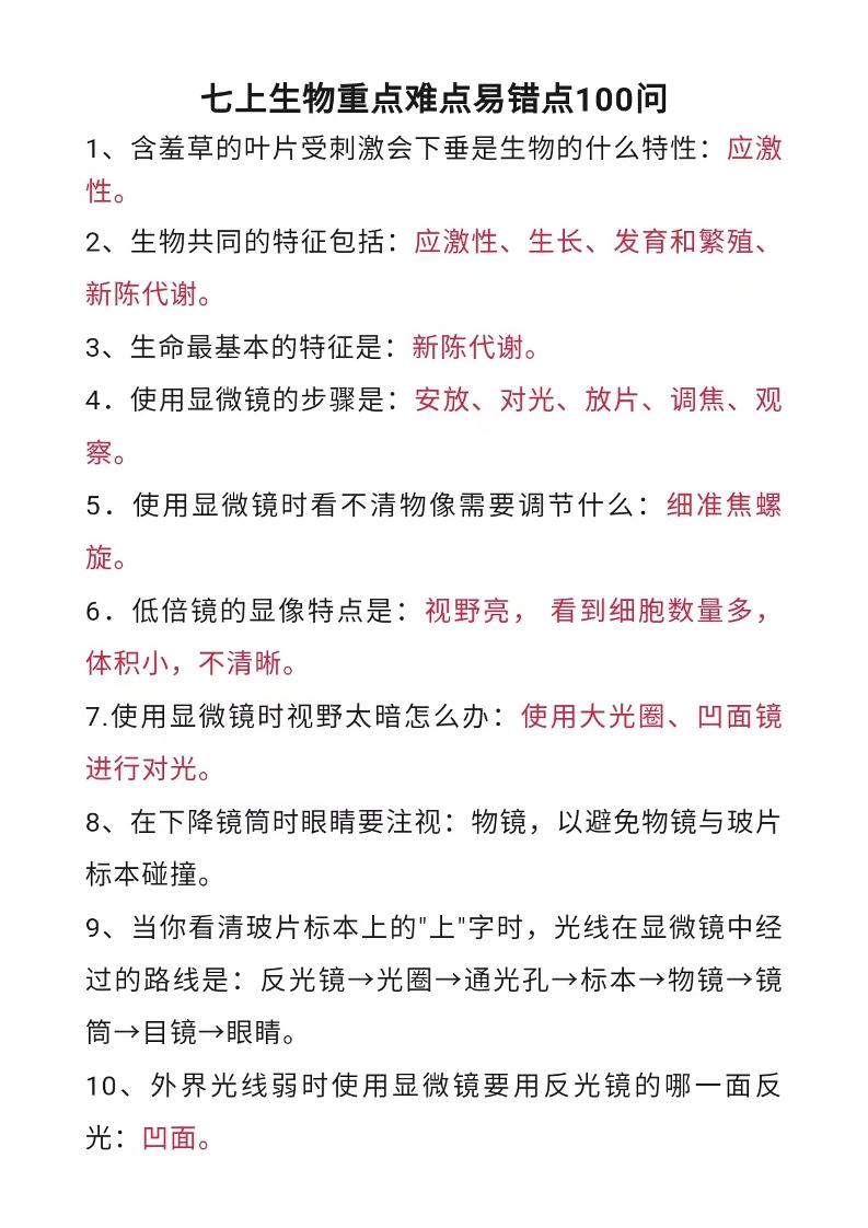小升初暑假|七上生物早背晚默小纸条(人教版)
