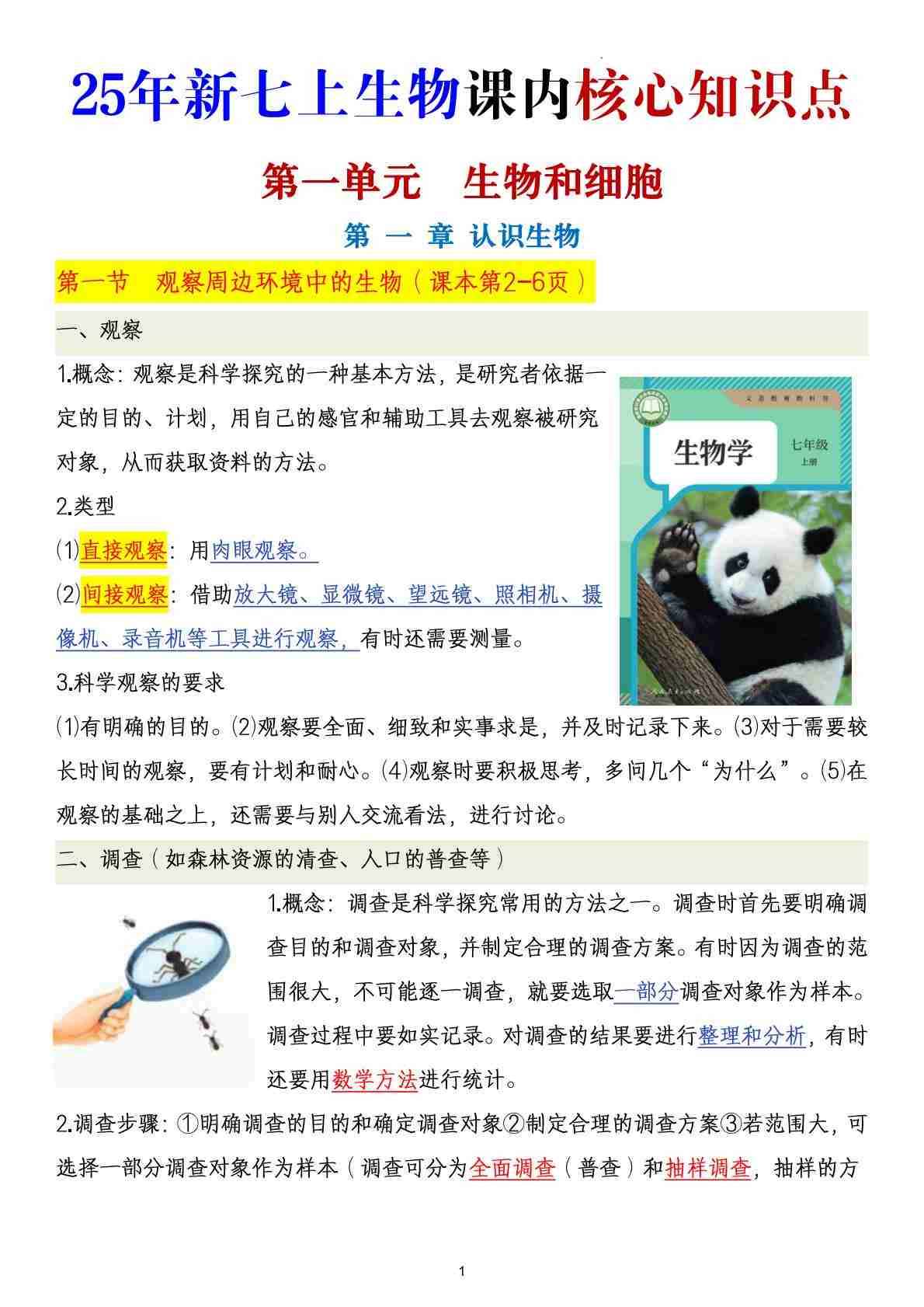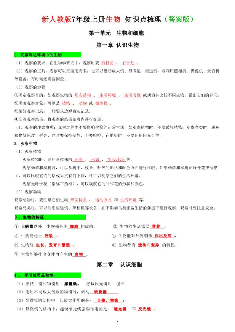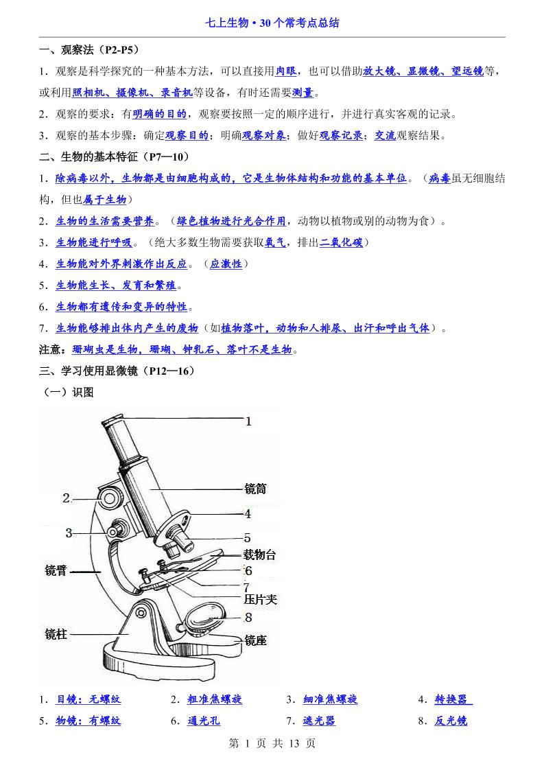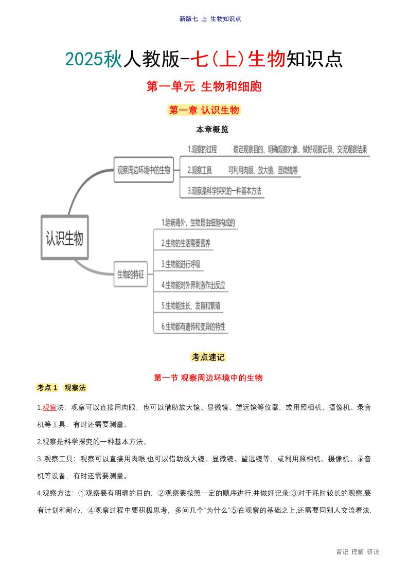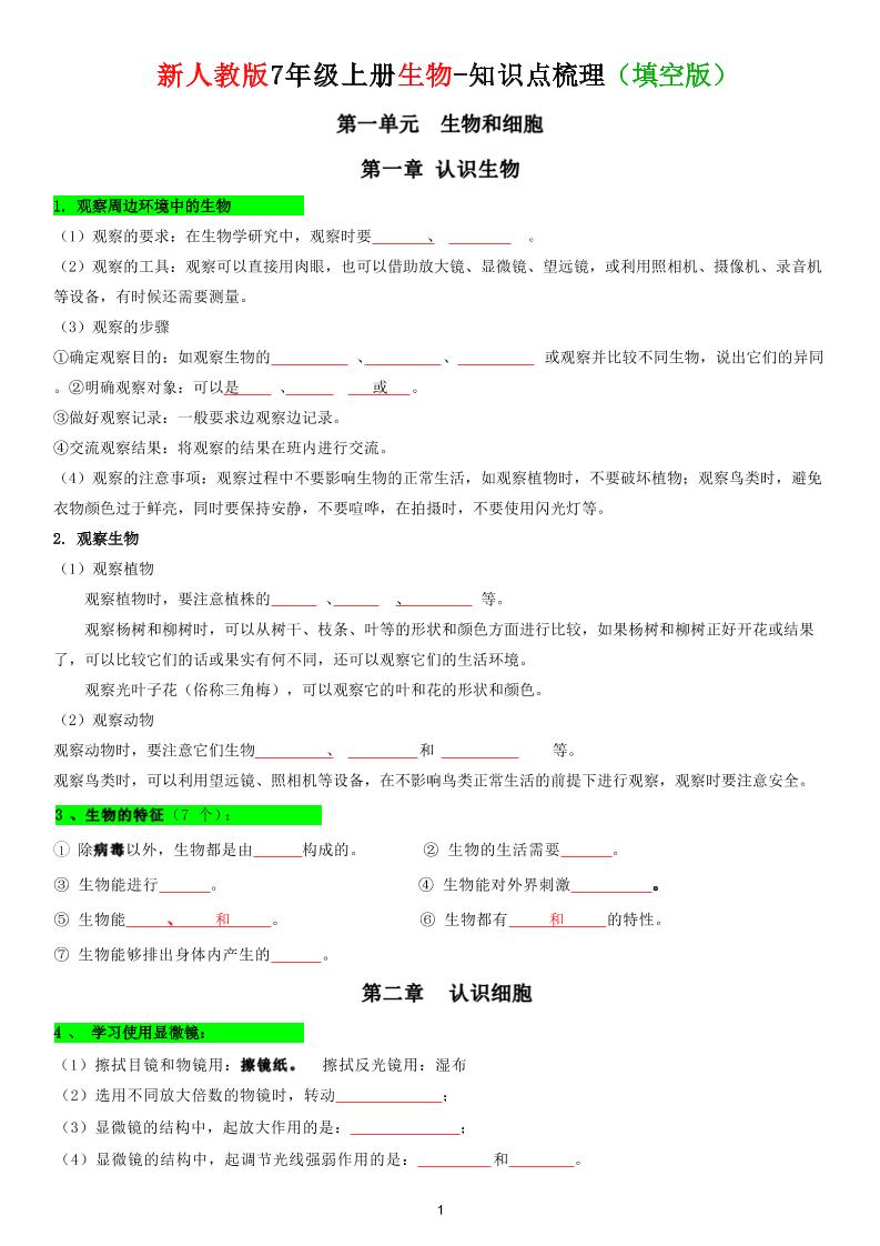 小升初暑假|七上生物早背晚默小纸条(人教版)