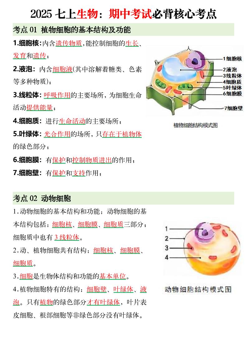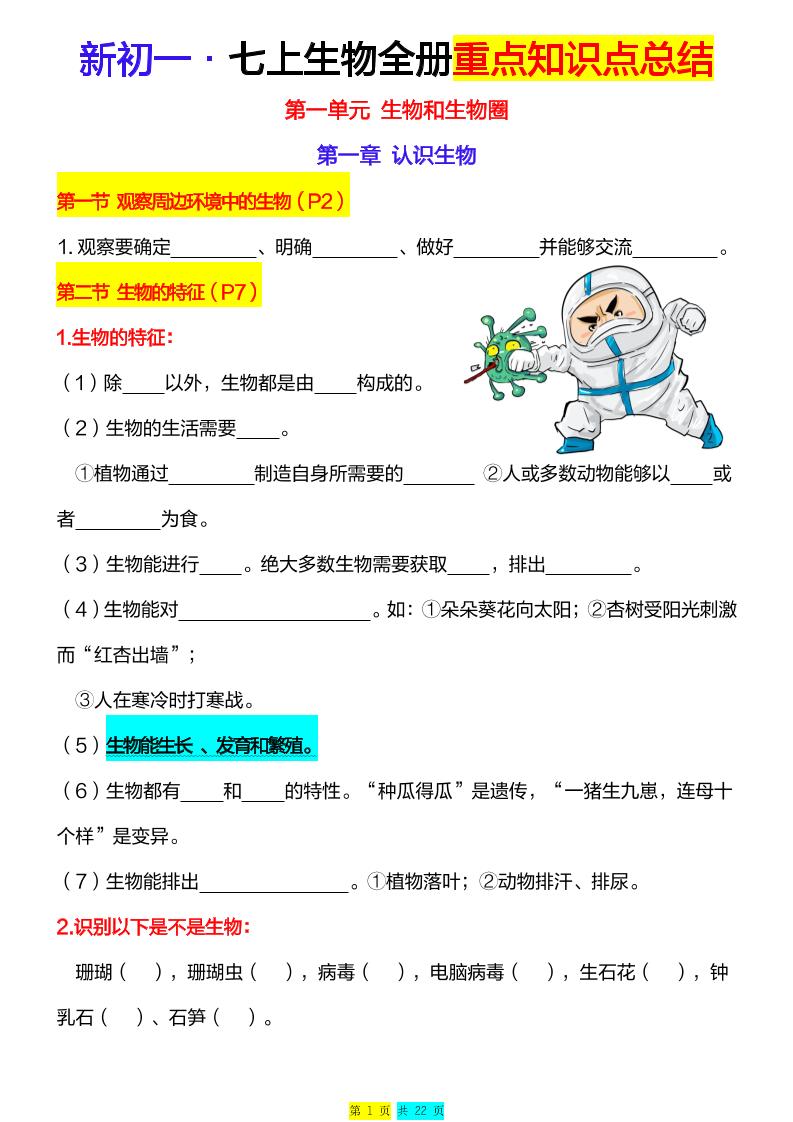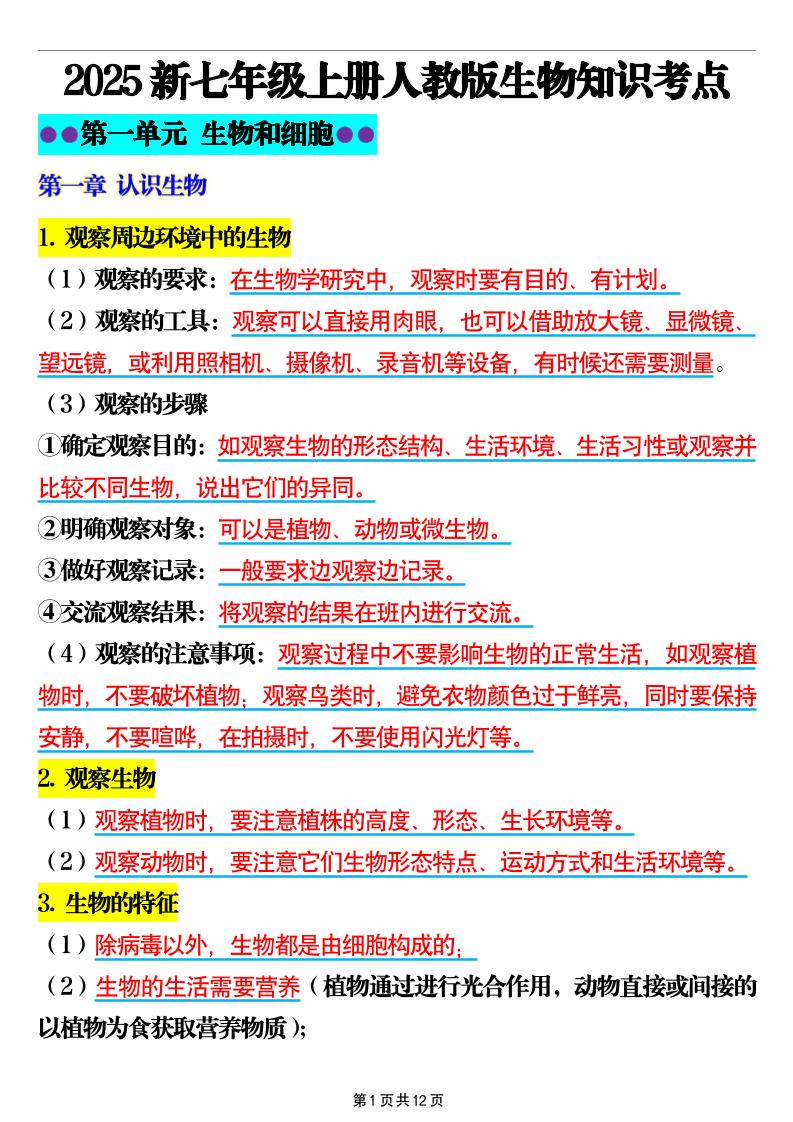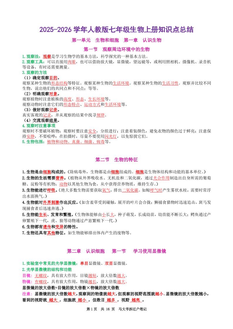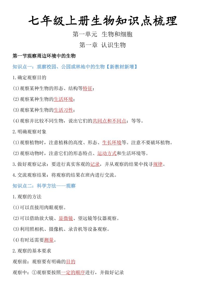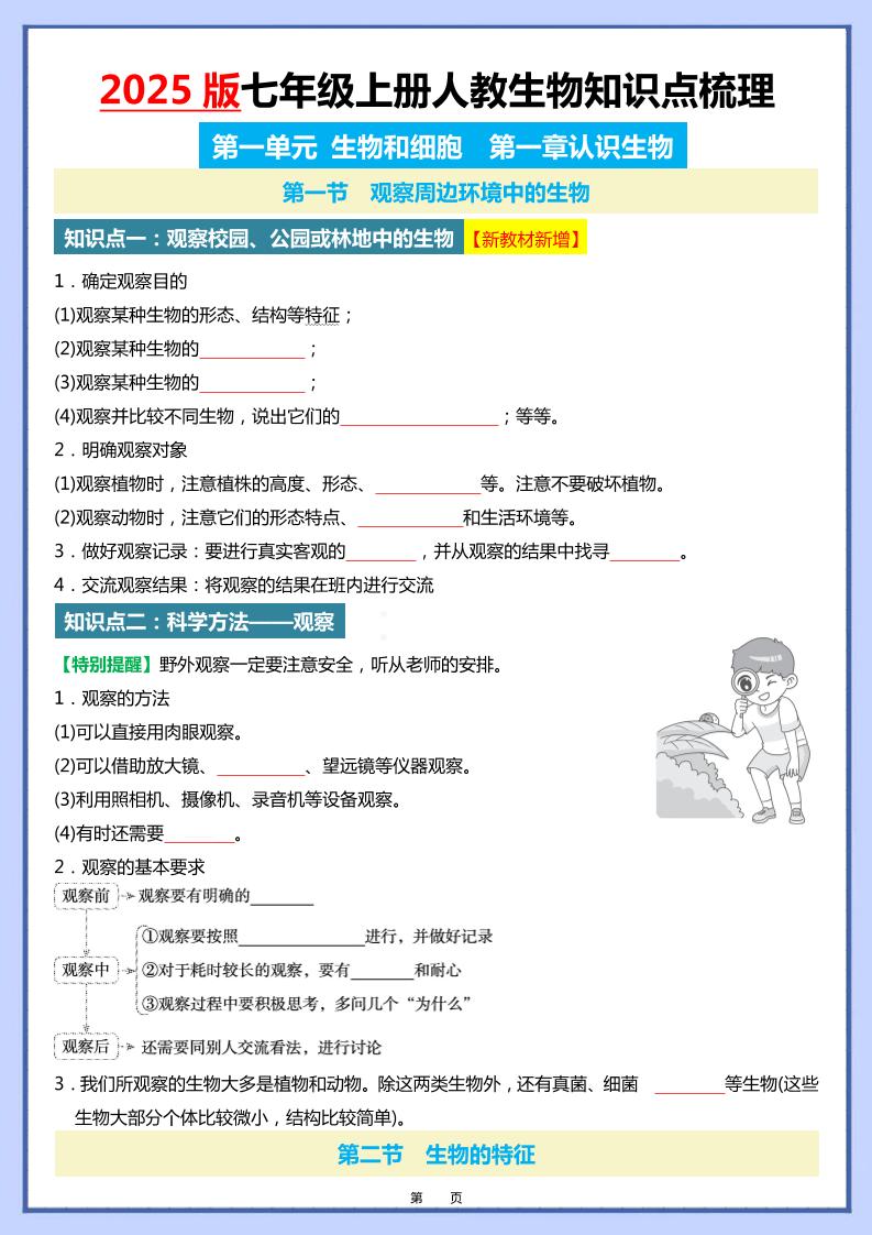 【暑假必背】25年秋七年级上册生物知识点总结(共25页)