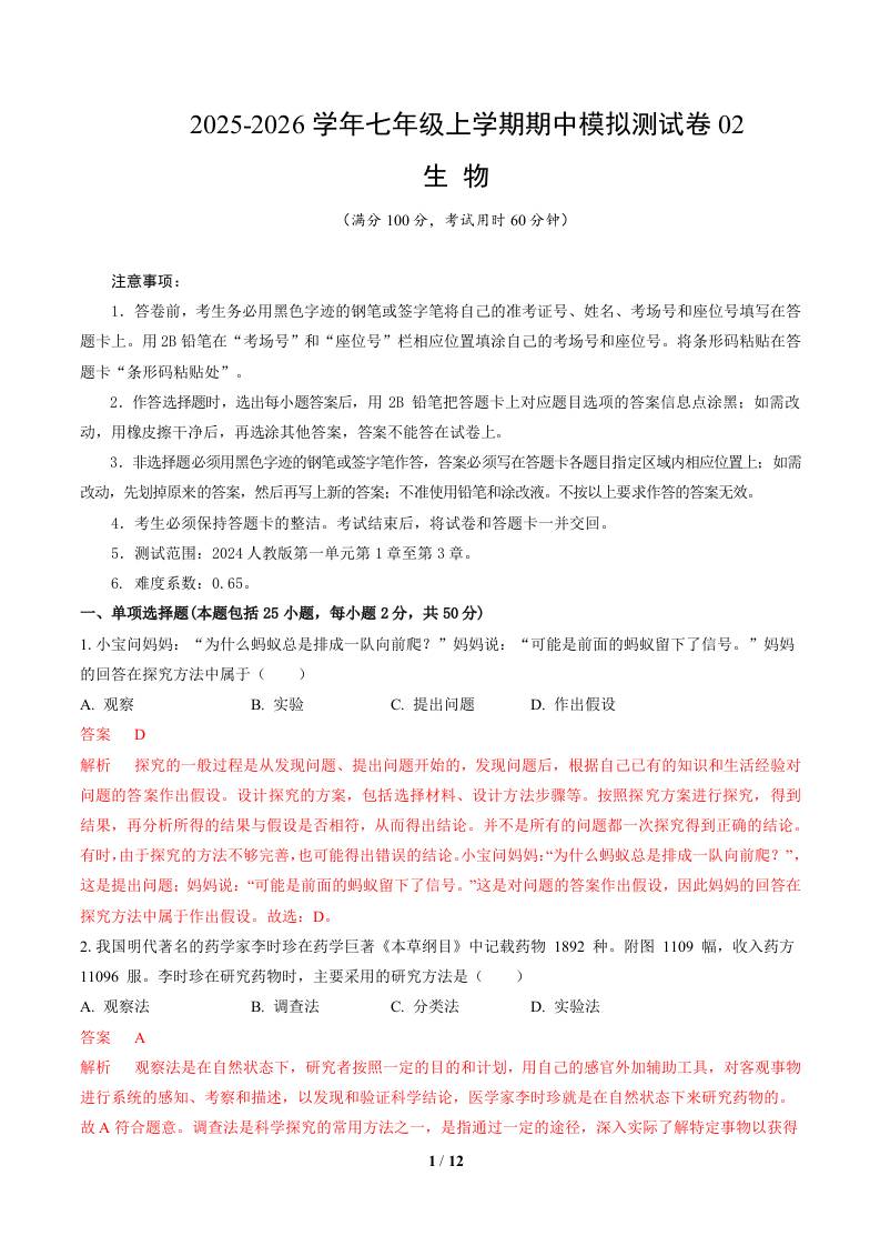 七年级上学期生物期中模拟测试卷02(新教材人教版)(全解全析)