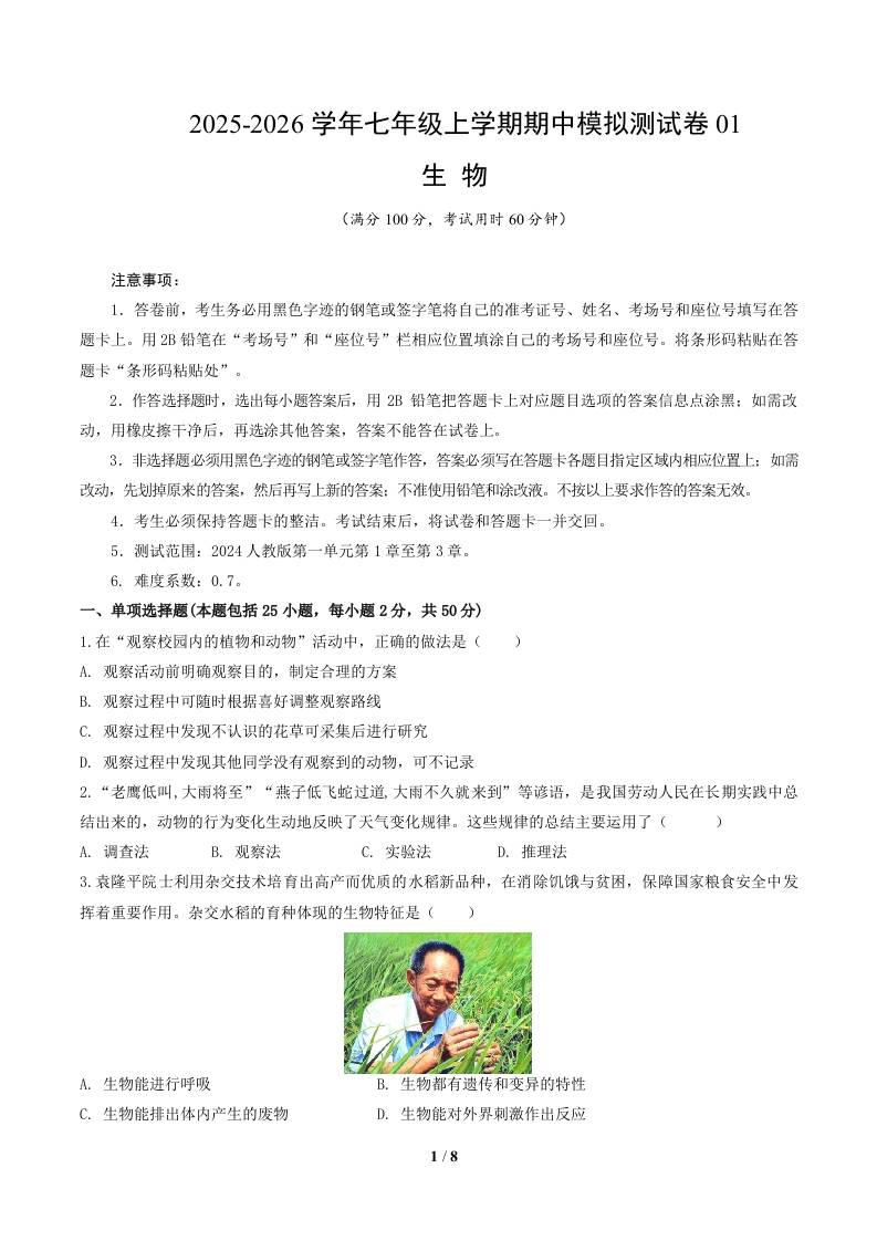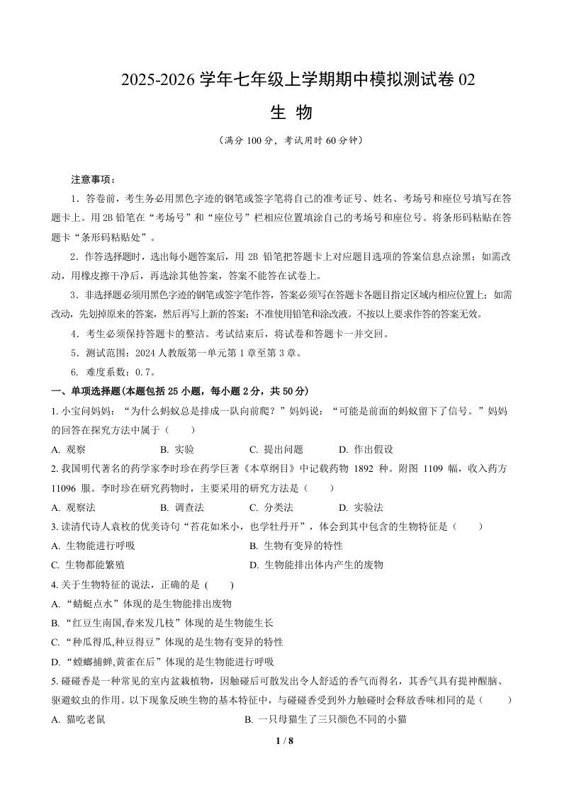 七年级上学期生物期中模拟测试卷02(新教材人教版)(考试版A4)