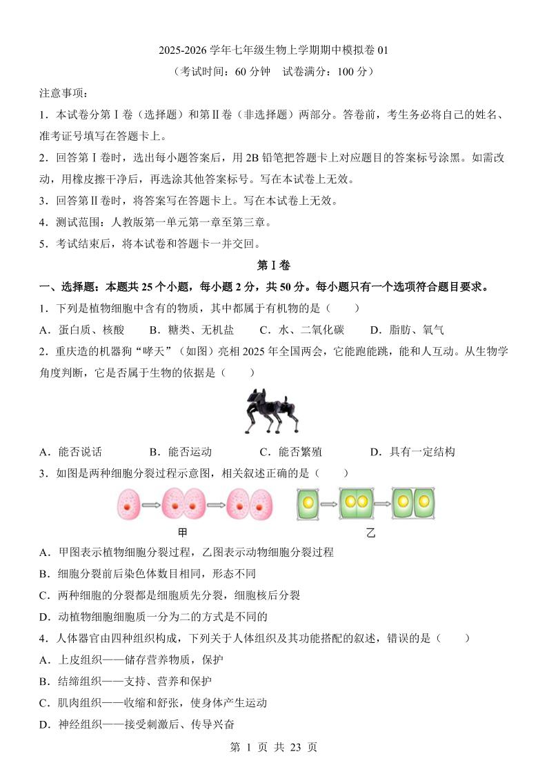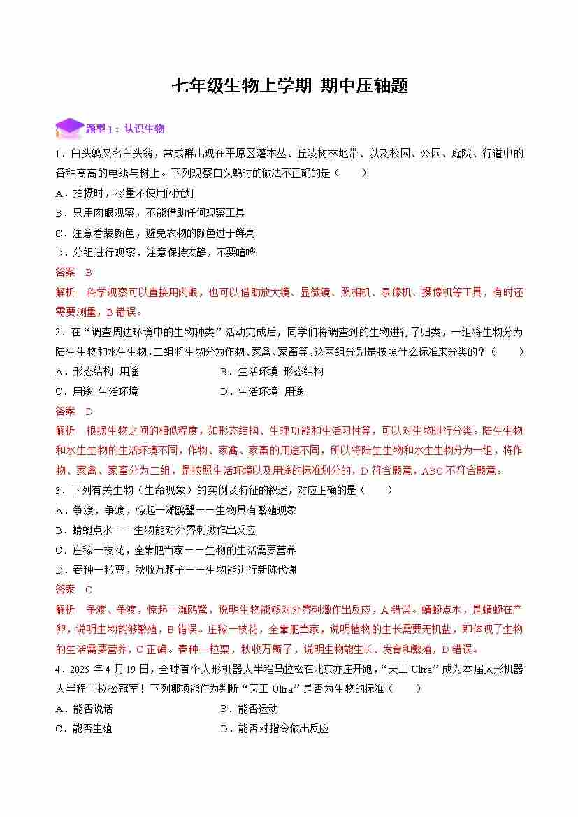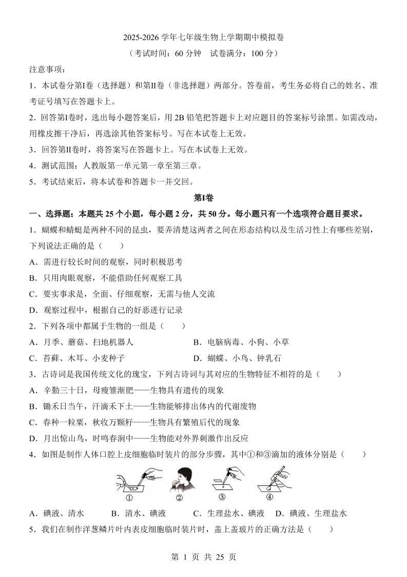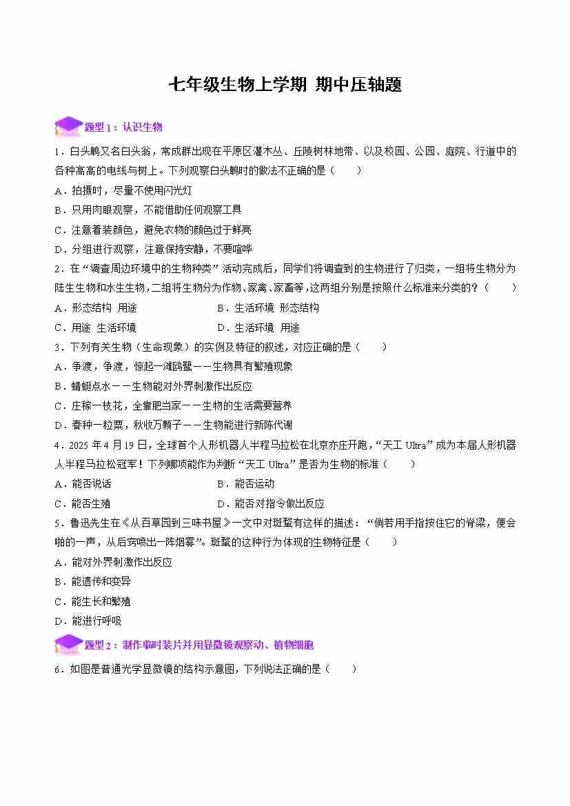 【人教】7上生物期中卷02【第1.1-2.1单元】
