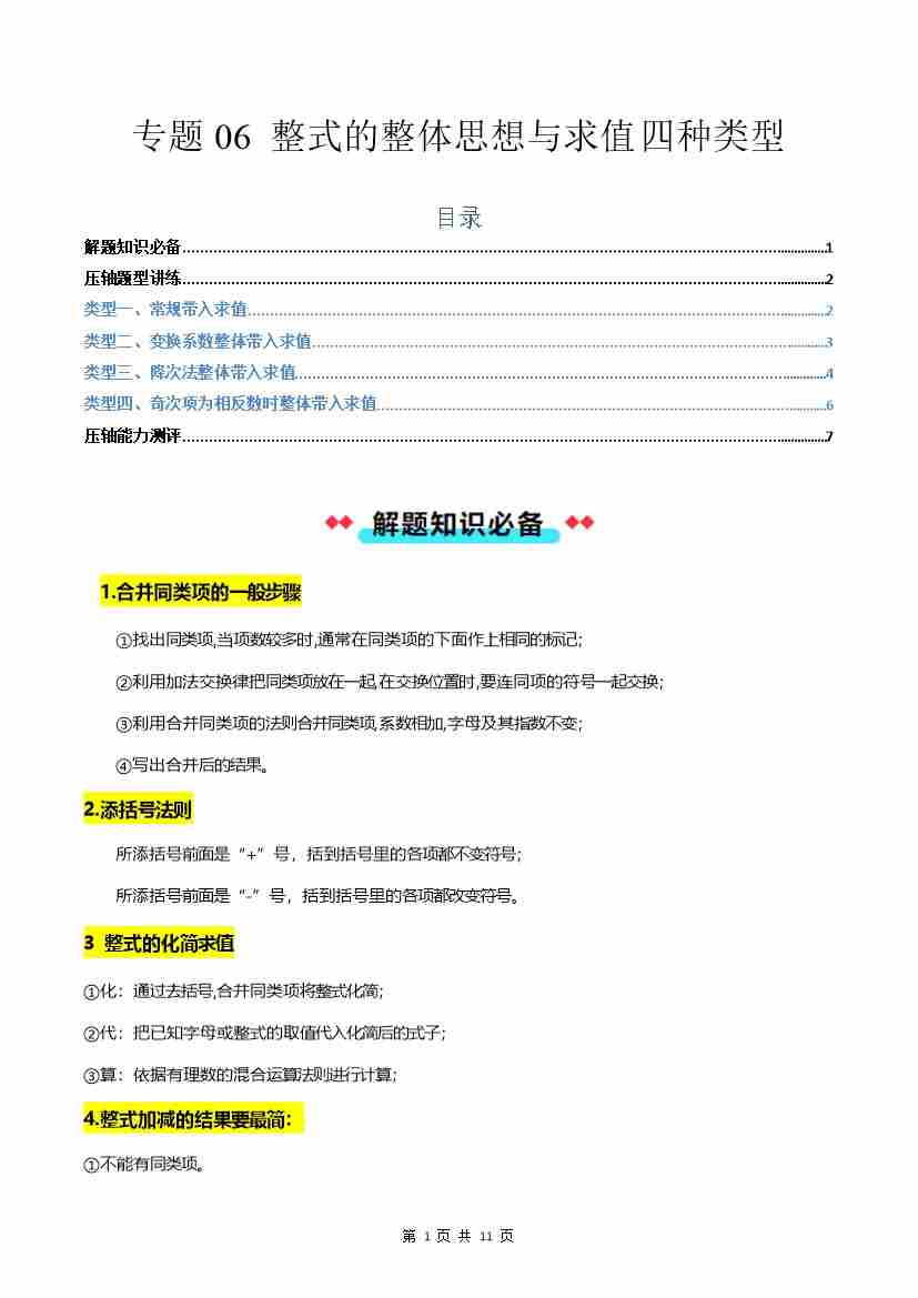 专题06 整式的整体思想与求值四种类型-原卷版