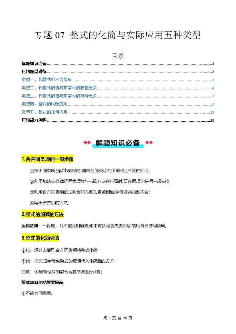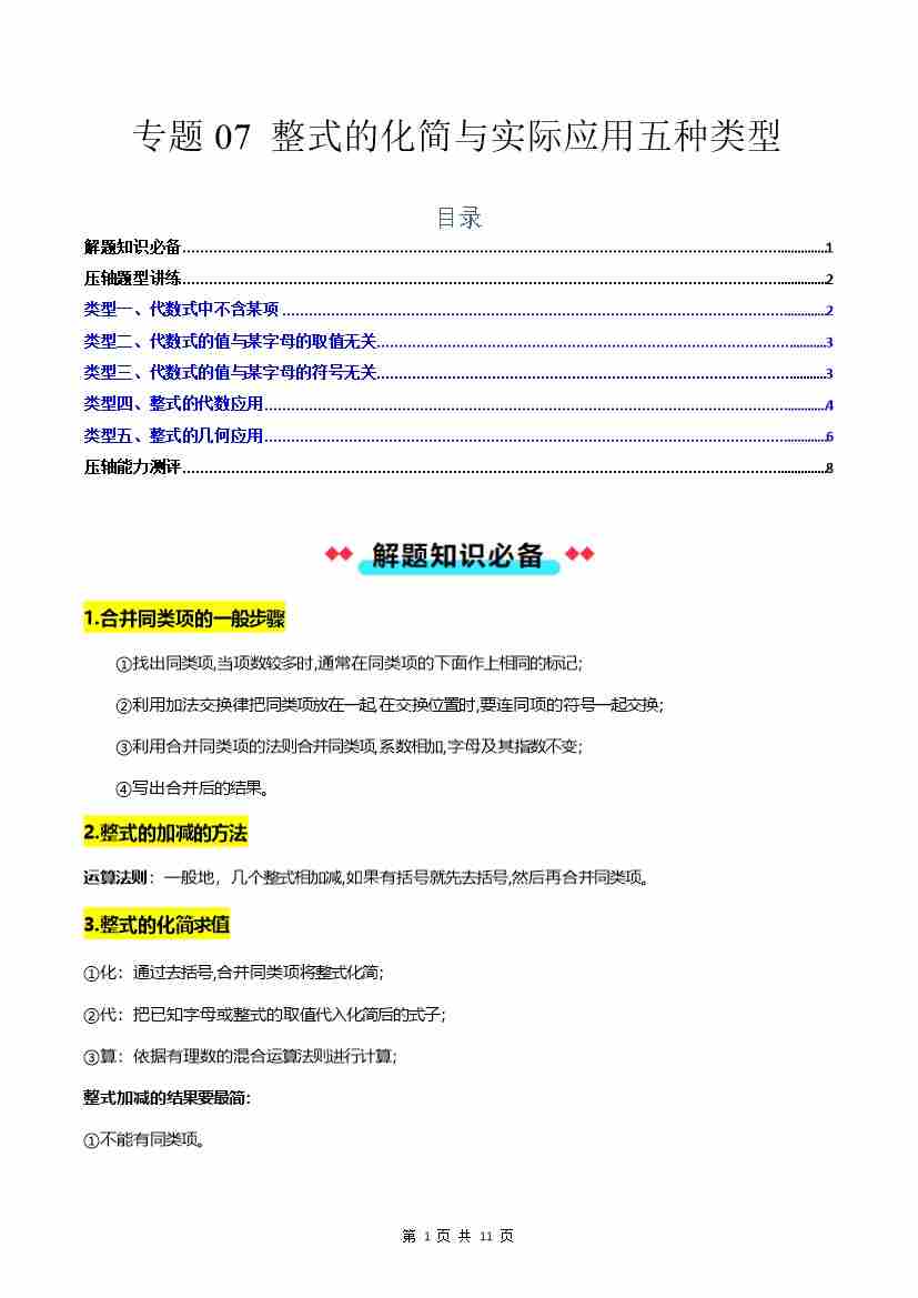 专题07 整式的化简与实际应用五种类型-原卷版