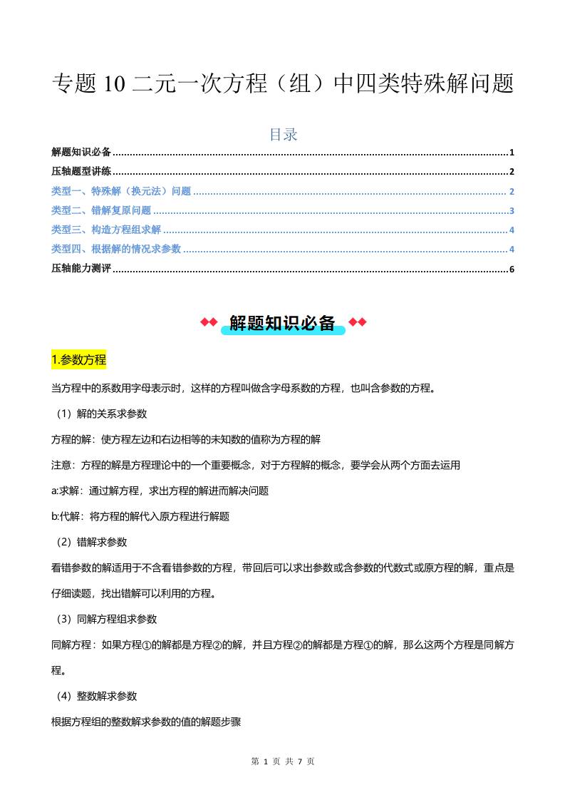 专题10二元一次方程(组)中四类特殊解问题-原卷版
