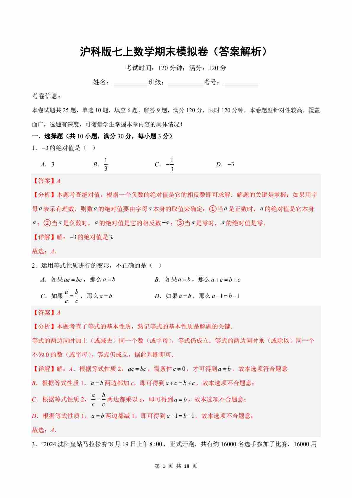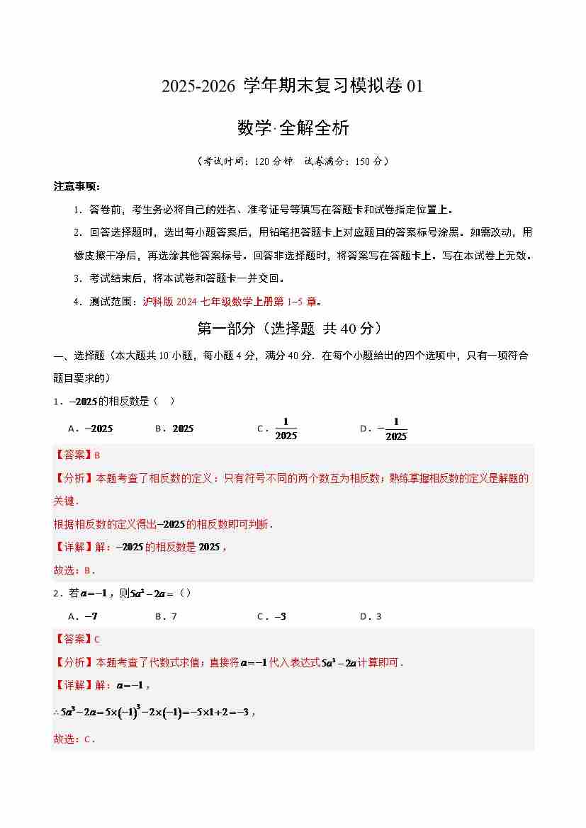 七年级数学上学期期末模拟卷01(新教材沪科版)(解析版)