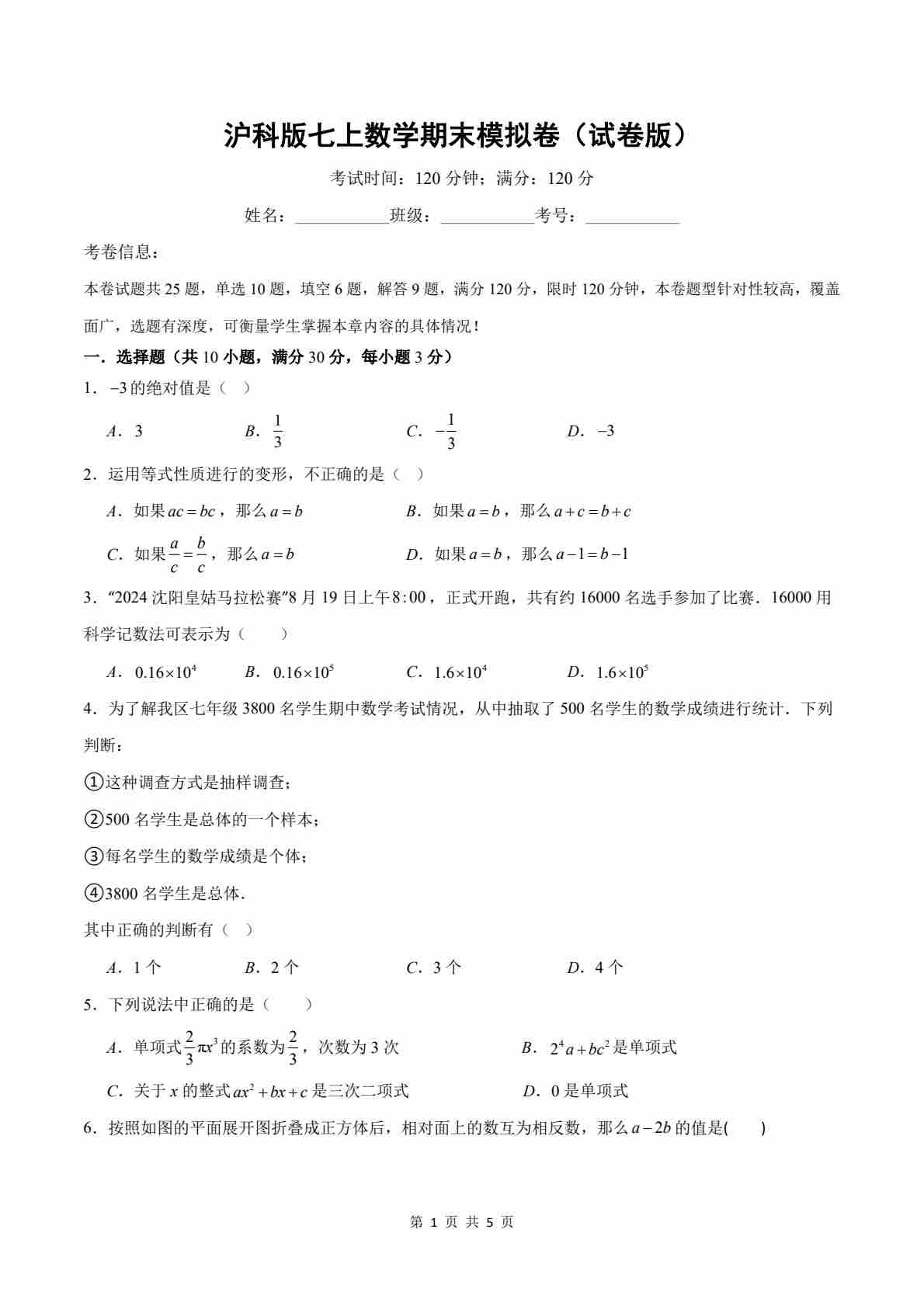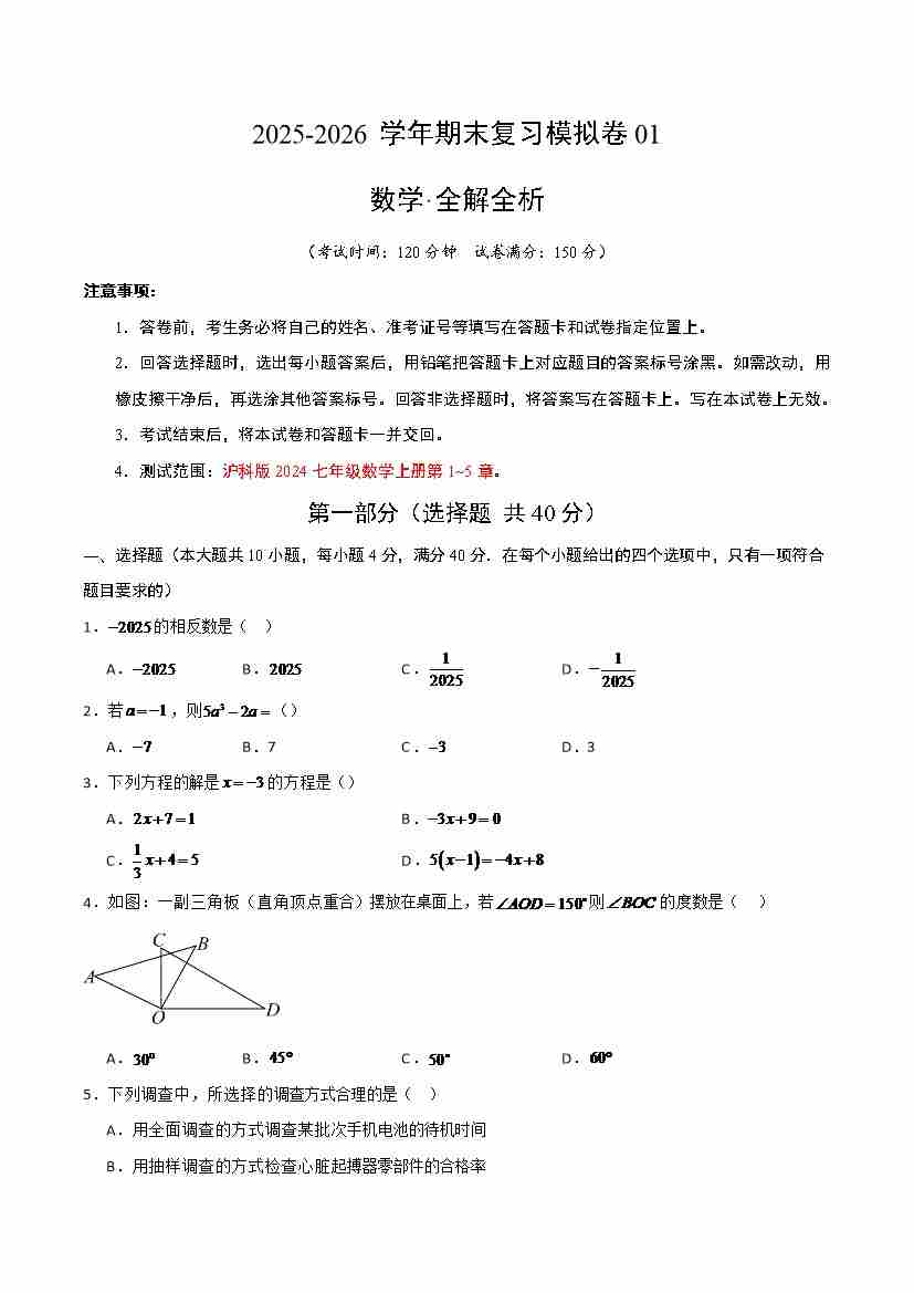 七年级数学上学期期末模拟卷01(新教材沪科版)(原卷版)