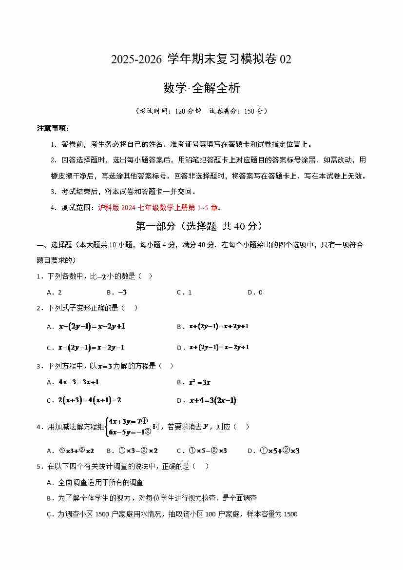 七年级数学上学期期末模拟卷02(新教材沪科版)(原卷版)