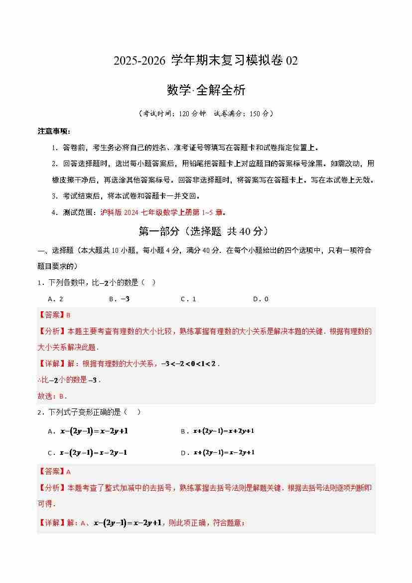 七年级数学上学期期末模拟卷02(新教材沪科版)(解析版)