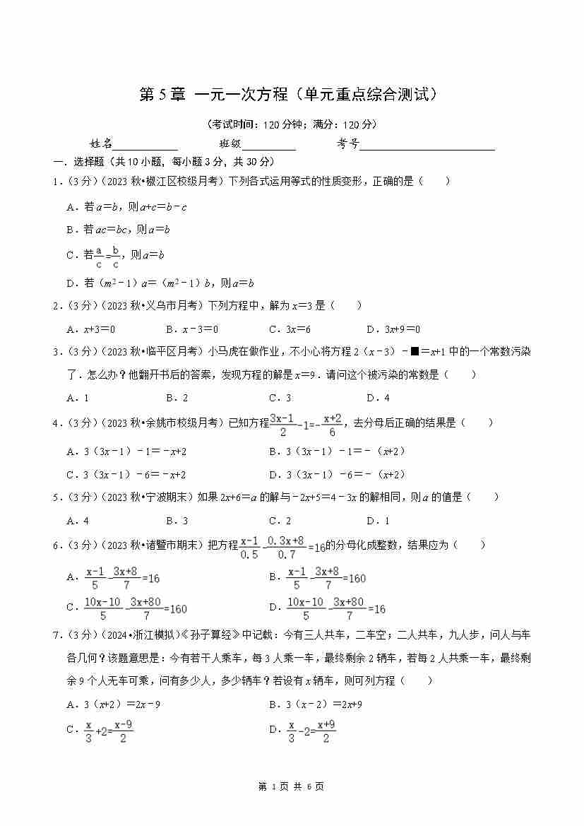 第5章--- 一元一次方程(单元重点综合测试)(原卷版)