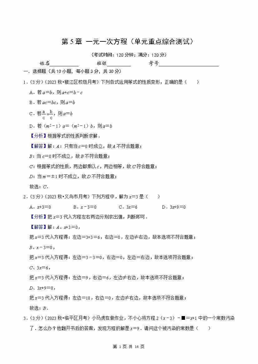第5章---- 一元一次方程(单元重点综合测试)(解析版)