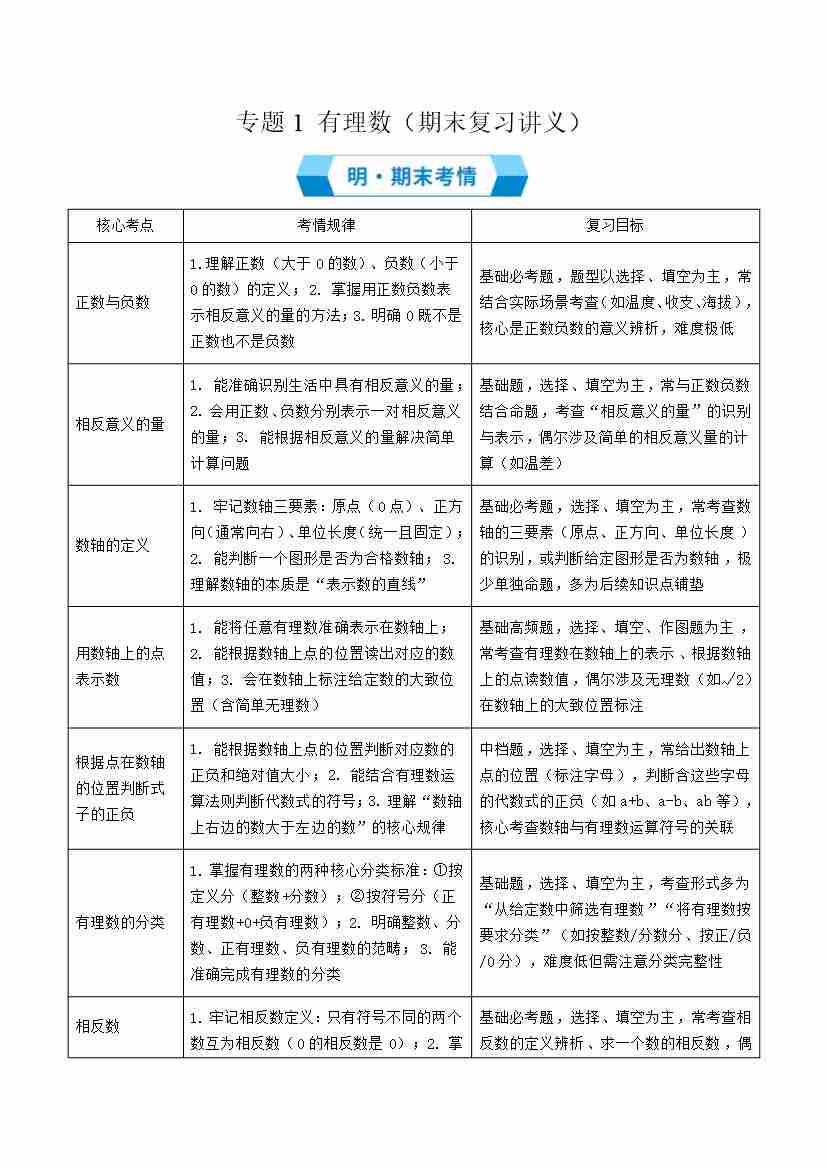 专题1 有理数(期末复习讲义)原卷版
