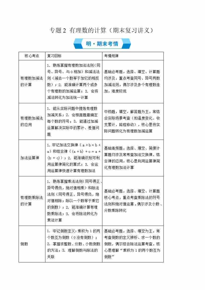 专题2 有理数的计算(期末复习讲义)原卷版