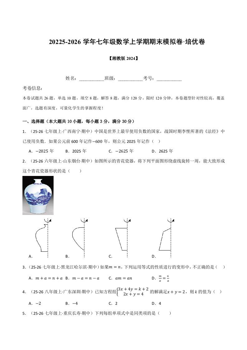 七年级数学上学期期末模拟卷(湘教版2024)(原卷版)