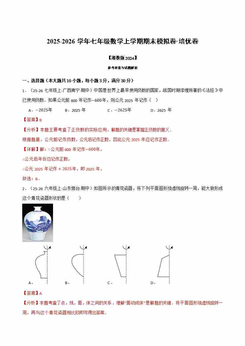 七年级数学上学期期末模拟卷(湘教版2024)(解析版)